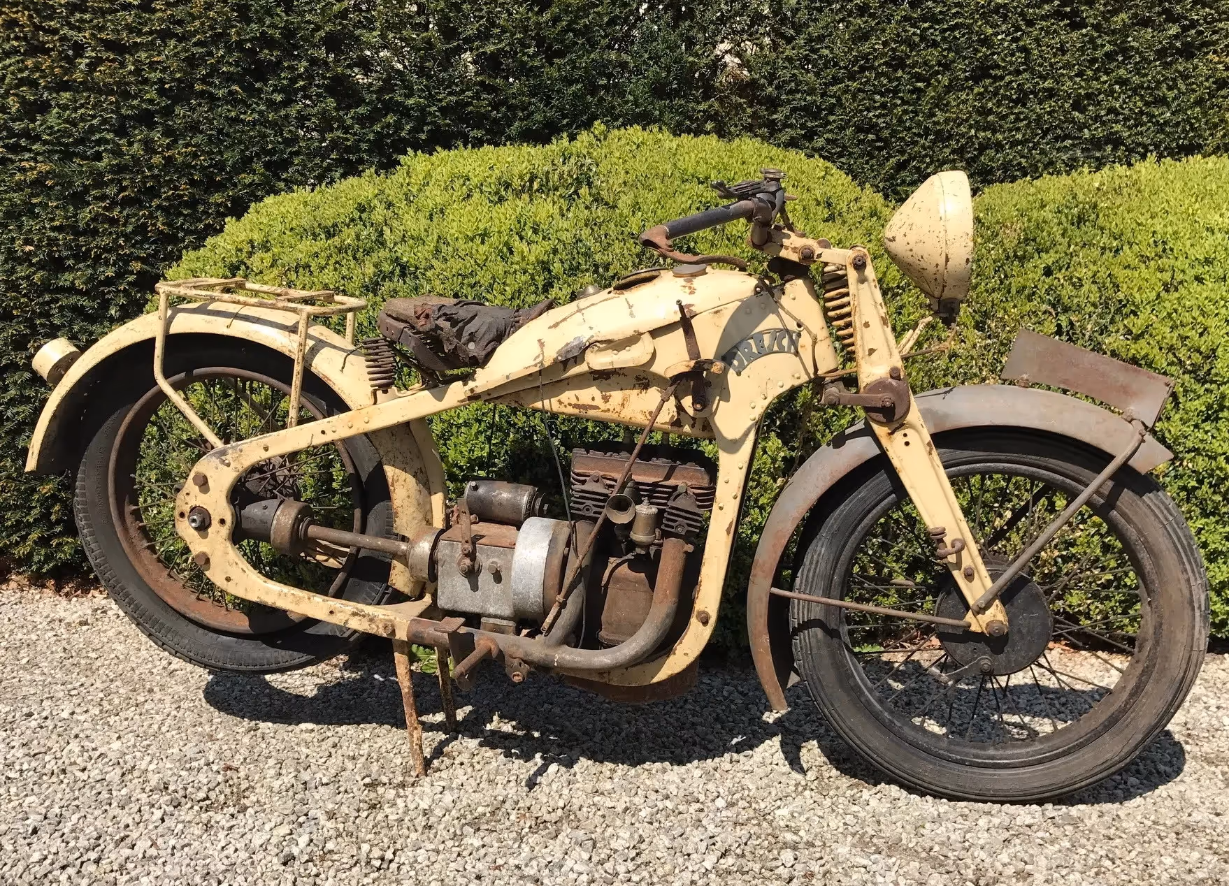 Unrestored and original French Dresch 500 Monobloc. This is the top model of Dresch with a 500cc 2 cylinder side valve in line with carden drive. Rare motorcycle with sprung handlebars as an option. This sprung steering wheel of the brand Planor was available in leaf springs and wire springs as on this model.