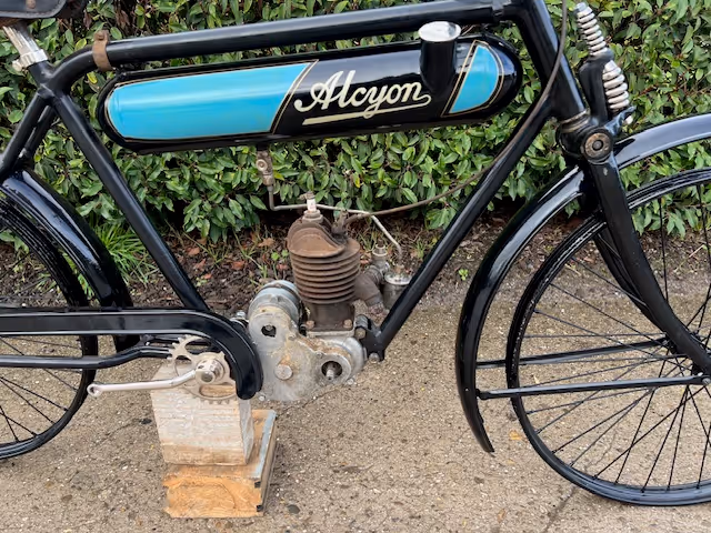 French Alcyon with Zurcher 98cc engine. This is an unfinished restoration with some small parts missing. Nicely repainted and now built together separately to show what is there;