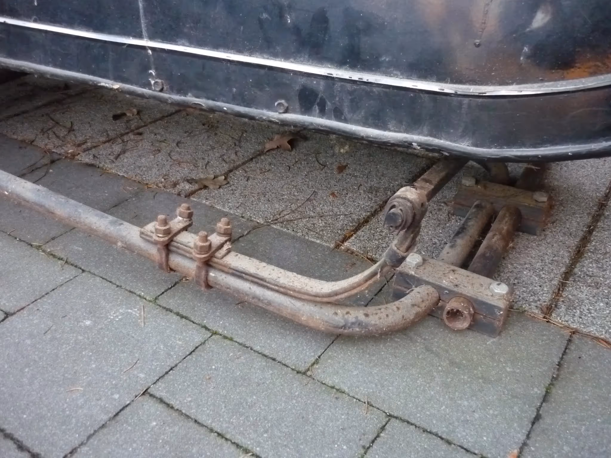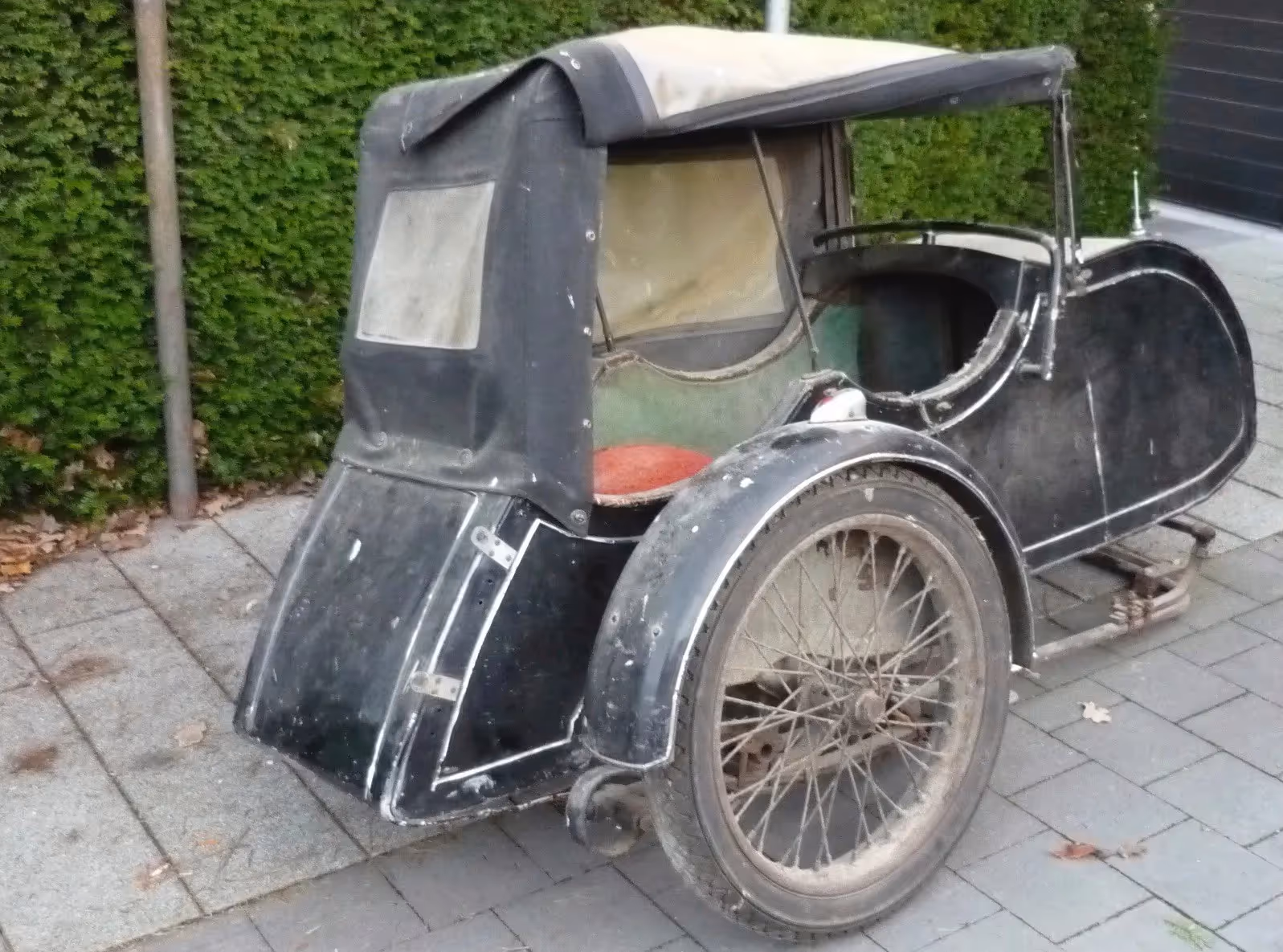 Belgian brand sidecar. This is the Luxe model with the patented 'Antivibrateur' suspension. The body is extra large for 1.5 persons. This is an adult and a child.