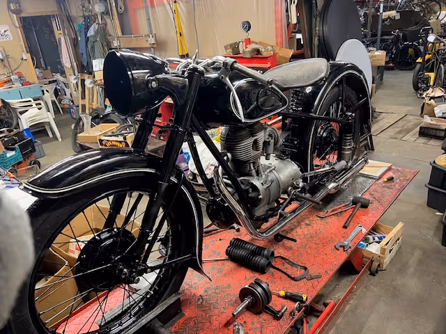 BMW model R25. This is a 250cc OHV from 1950. Motorcycle was disassembled years ago and repainted and new chrome, but never assembled. I have now put it together separately to show how complete it is. Is ecventually for sale with additional engine, transmission, cardan and rear pound.