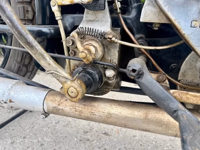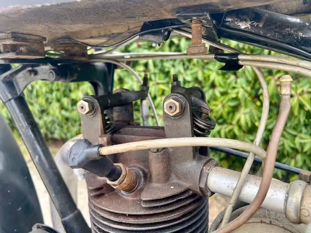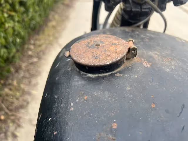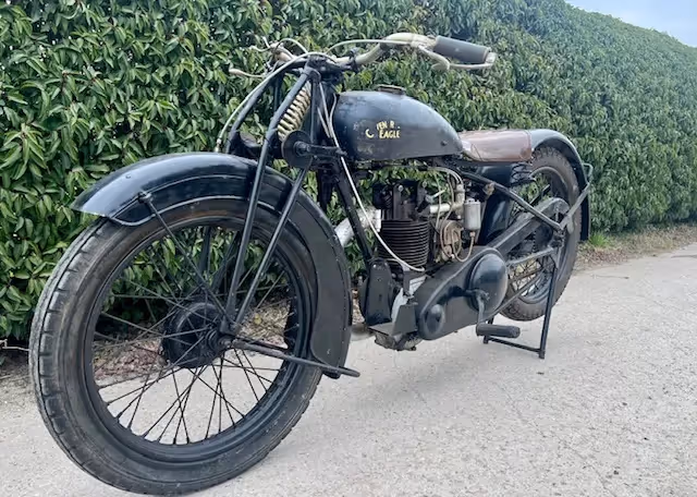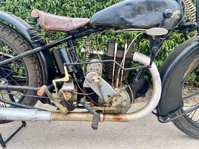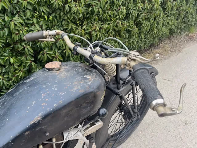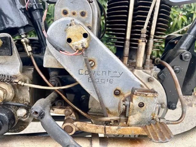English Coventry-Eagle model Flying 350. This is a 350cc Jap OHV early model with ears. This motorcycle is a late 1928 or early model 1929. The new models were presented at the motorcycle fair in August. Engine block is from 1928 and the new model (1929) had the new rounder saddle tank that was thus proposed in August 1928 for 1929 season. Engine is loose and gear shifting. Nice base to restore or to make and nice light and fast beach racer.