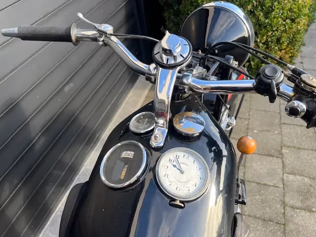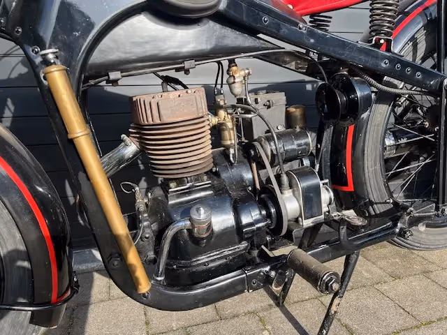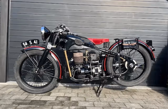 French Dresch National, this is the 350cc 1 cylinder version of the Monobloc 2 cylinder. So same pressed frame and shaft drive. This motorcycle is one that was left at the distributor, never sold at the time. Was repainted in the '80s but otherwise completely original. Even with the original battery. Has never run and the 13km on the counter is not from riding but the distance this bike has been pushed around for the last 91 years.
