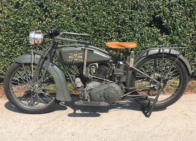 American Excelsior model 19. This is a 1000cc ioe V-twin of late 1918 early 1919. This motorbike has the reinforced front fork and has served in Europe at the end of WWI.
