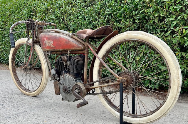 American Excelsior 1000cc board track racer. This is a 1000cc OHV in a Short coupled stock race frame. This frame differs from a standard street version in that it is shorter and lower, no gearbox, no suspension fork and racing saddle and handlebars. Around 1916, Excelsior was the fastest racer in the world! Motorcycle is technically restored and starts and runs well.