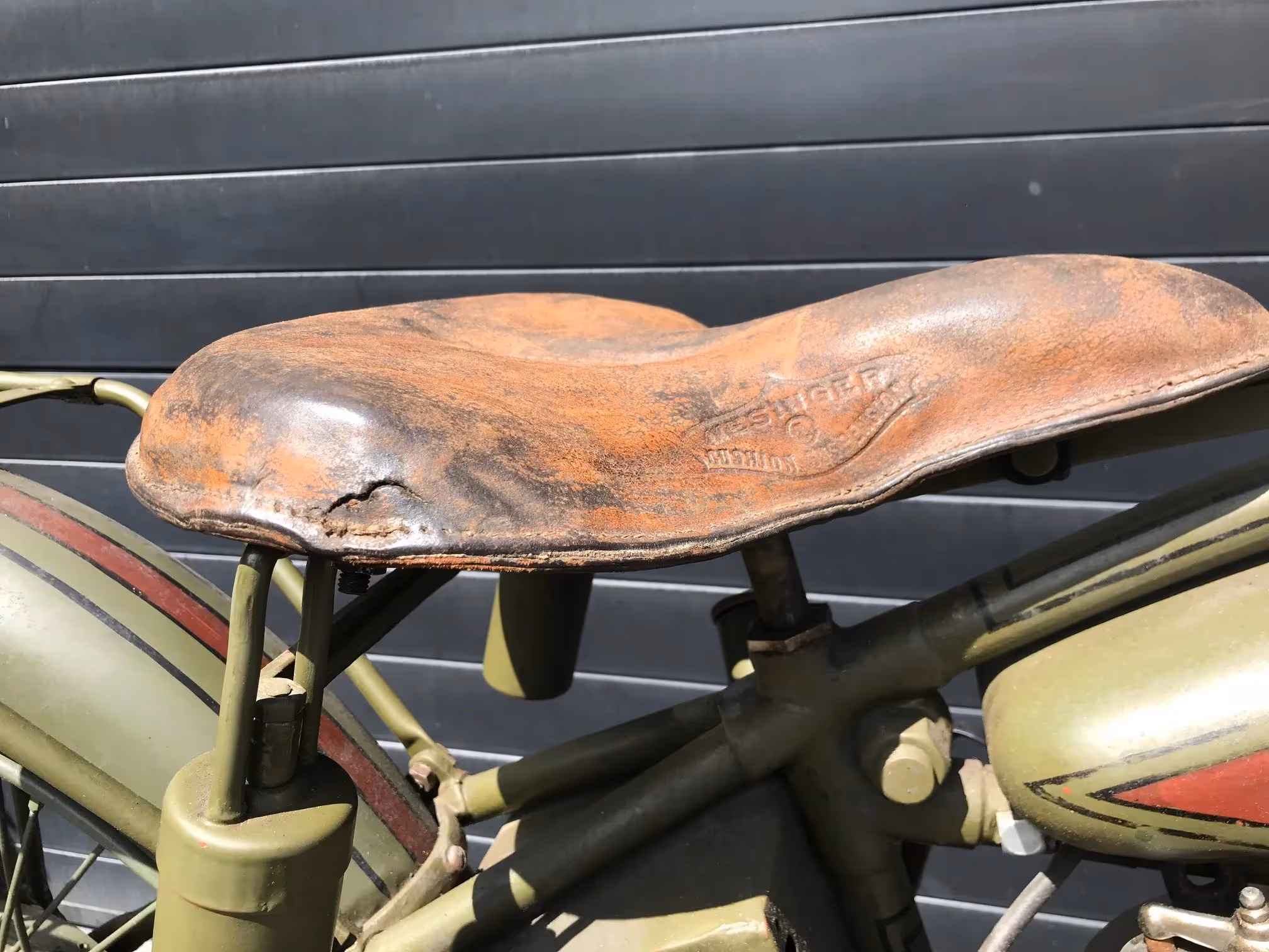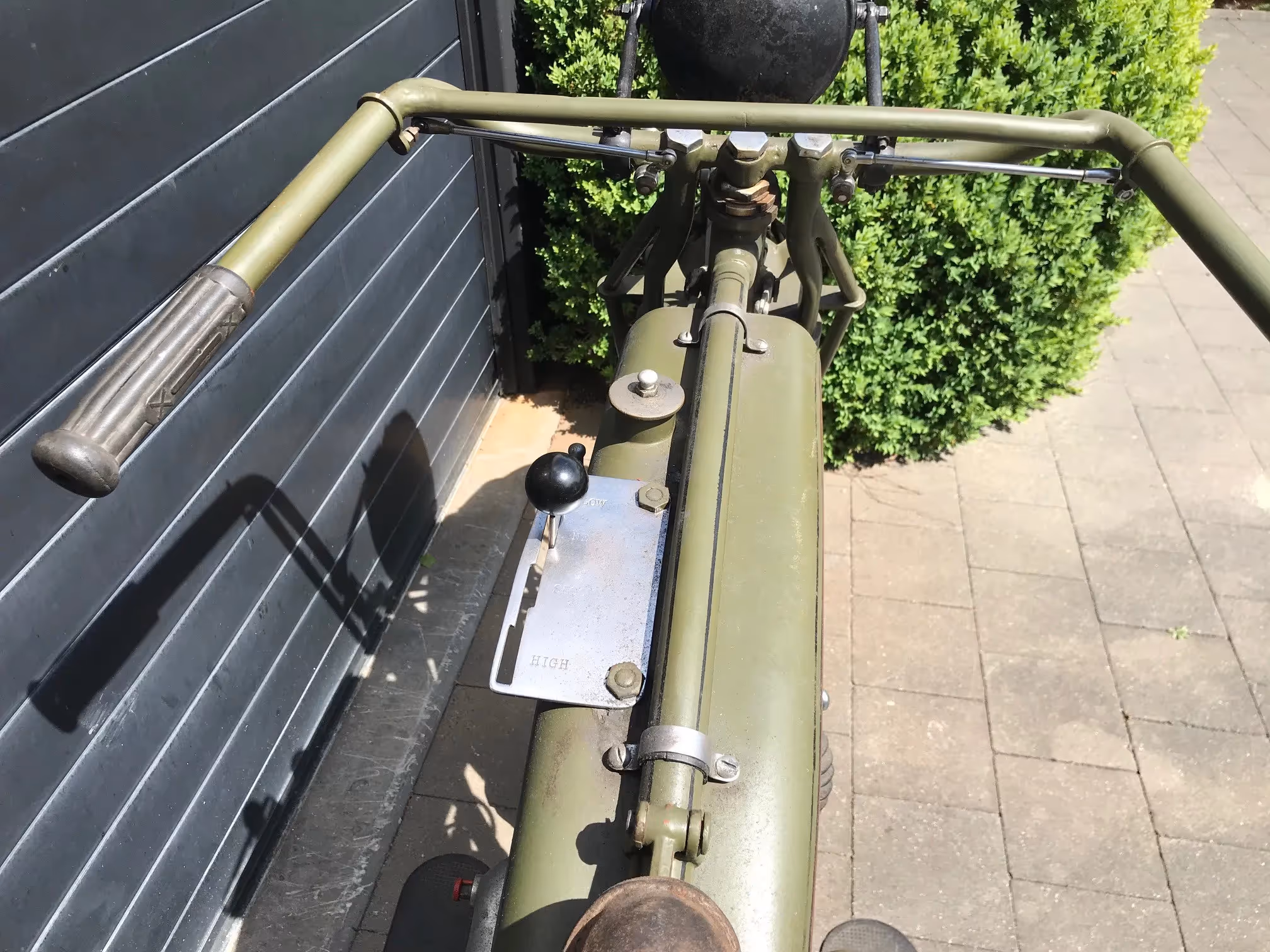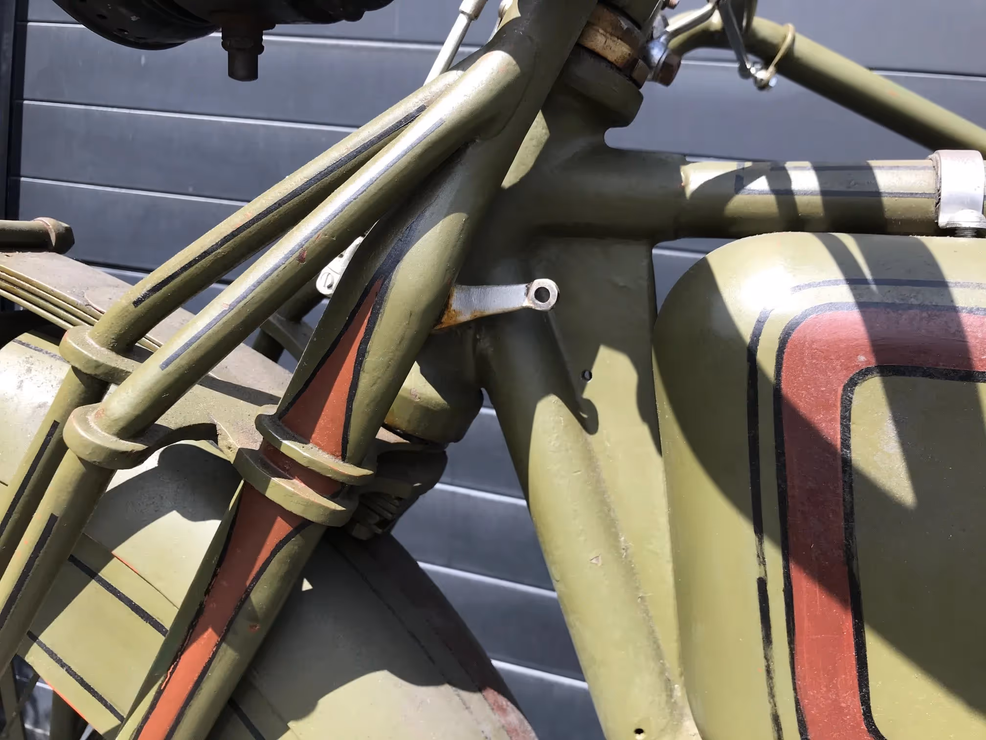 This army model was from 1918 also available as a public model and one could obtain this sturdy front fork for 5 dollars extra. An option often used for sidecar riders.
