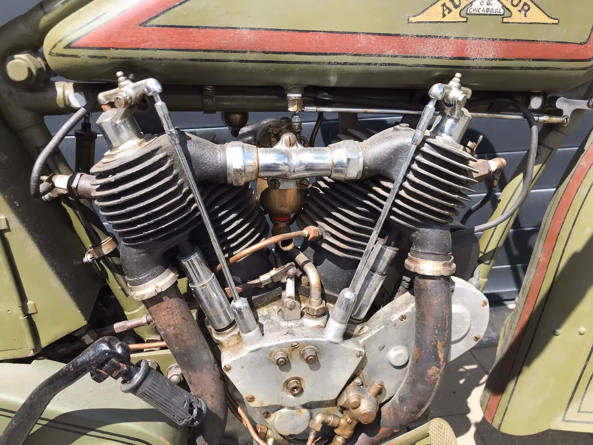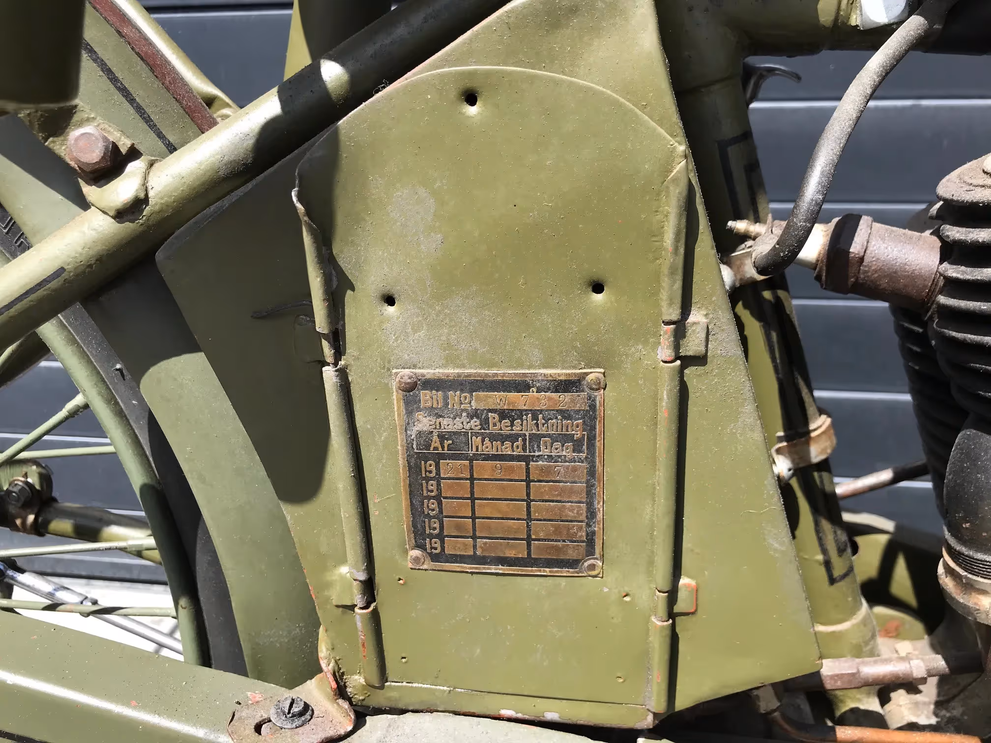 American Excelsior model 19. This is a 1000cc ioe V-twin from late 1918 early 1919. This motorcycle has the reinforced front fork and served in Europe at the end of WWI. After this it was first registered in Sweden on 7/9/1921 in Dalarnas. Motorcycle comes from the MC collection in Sweden. Motorcycle still needs some work like the bars of clutch/rear brake on the left side and the kickstarter needs to be checked as well.