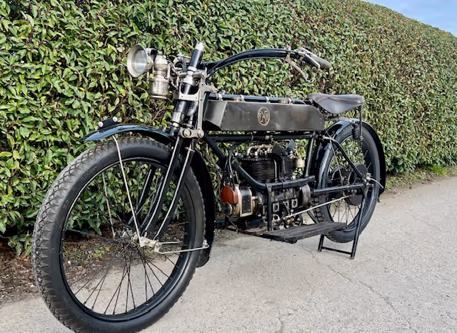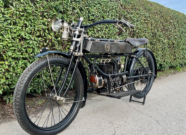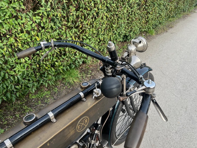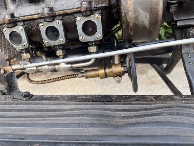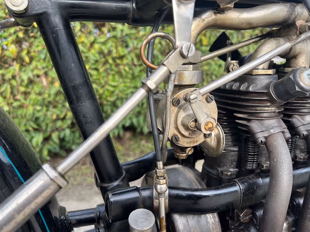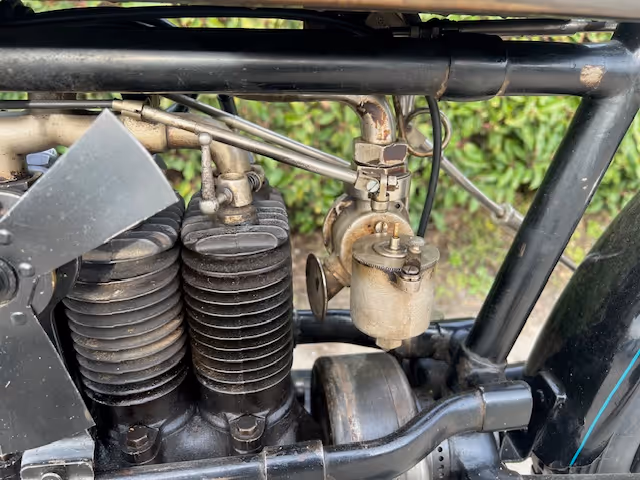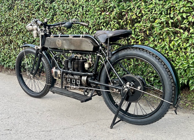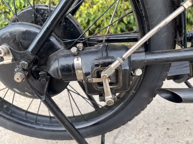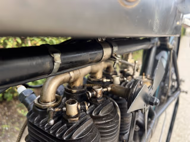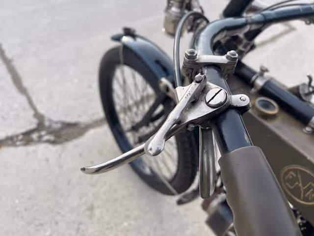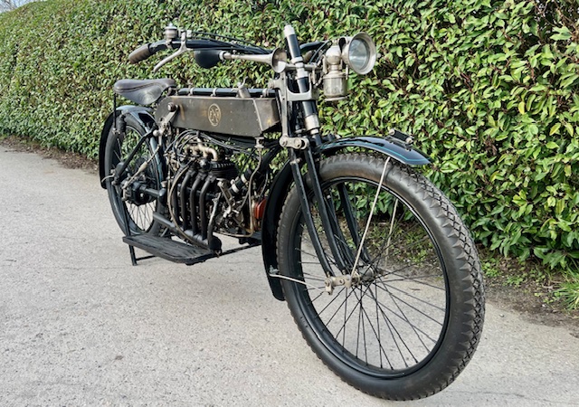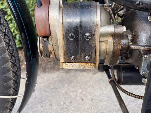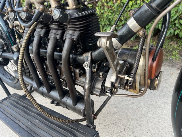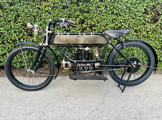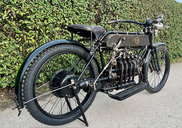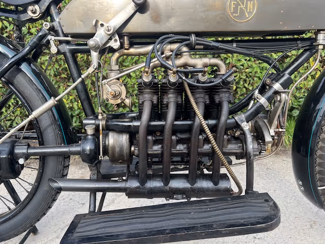 Belgian FN 4-cylinder 500cc from 1913. Rare model with kick starter at the front. This model has a clutch and a 2-speed gearbox on the cardan drive. Older restoration but everything is original. As an option, it has a fan that is driven by a cable and drive wheel that runs against the flywheel.