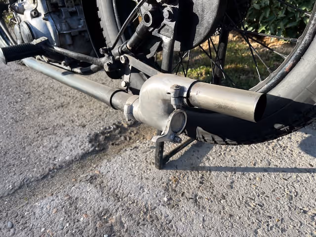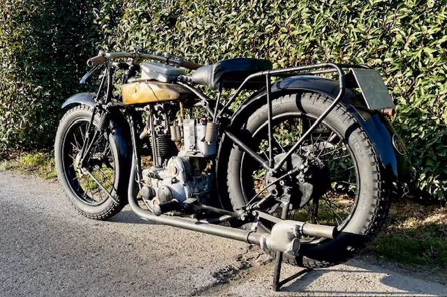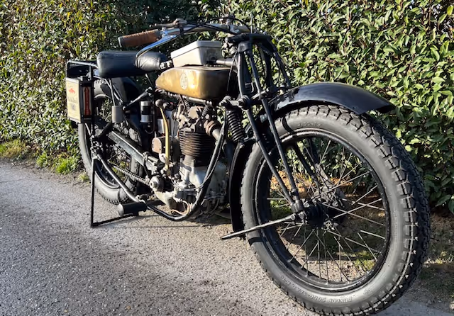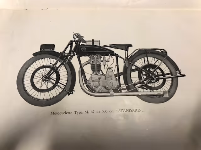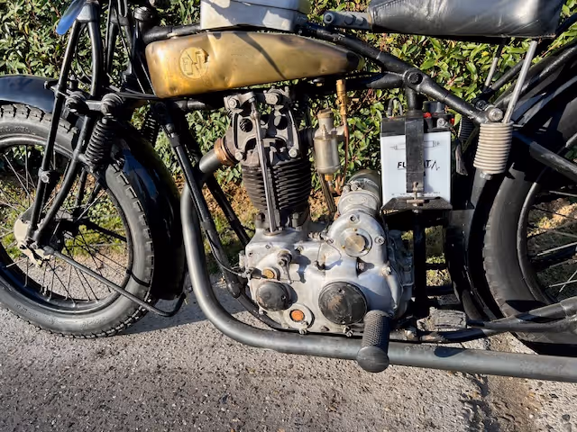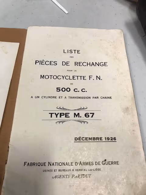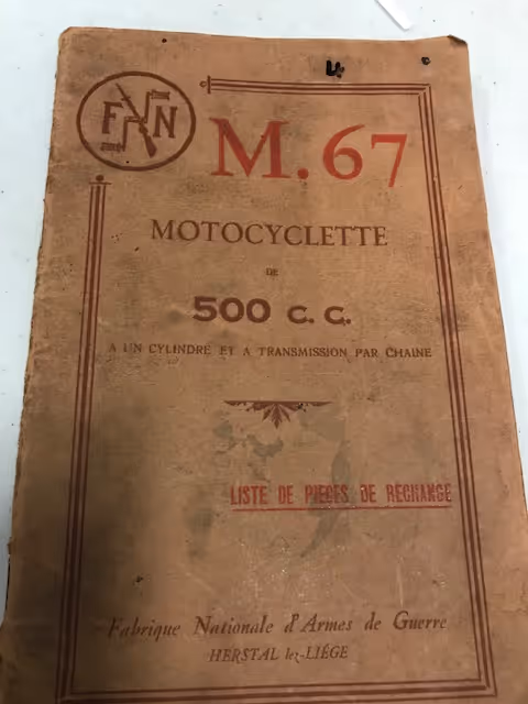 Belgian FN model M67A. This is a 500cc overhead valve model from 1926. The 500cc overhead valve model is only known to the public with the fuel tank in two halves over the upper frame tube, but in 1926 the Confort model was delivered with the regular M60 copper tank between the tubes. Check the catalogs! These motorcycles are rarely offered for sale. This is a fully restored motorcycle in very good riding condition. The well-known balloon tires with bead rims were once replaced by normal tires and wheels with brake drums, but these rims with tires and brake pulley with brake levers and the correct levers on the handlebars can be supplied for €2500.