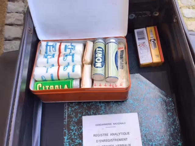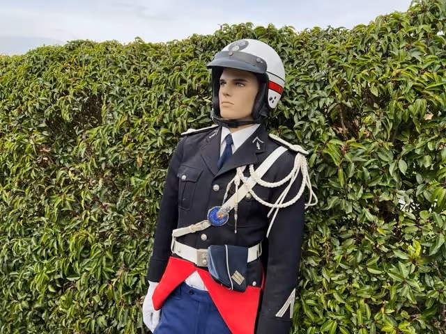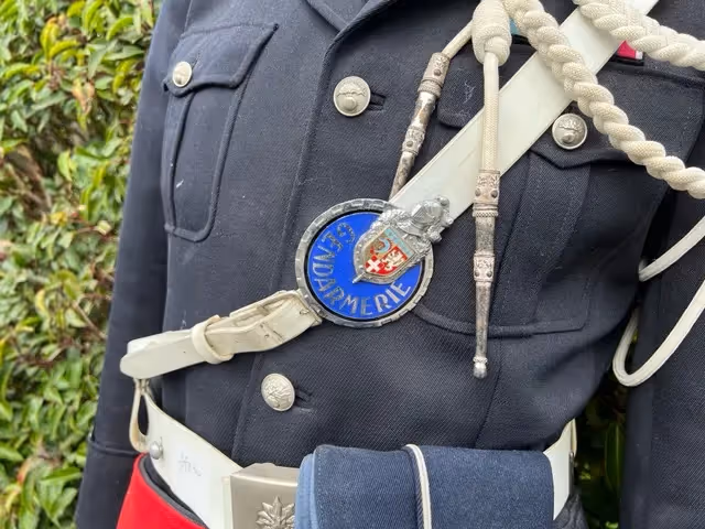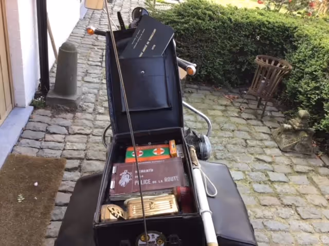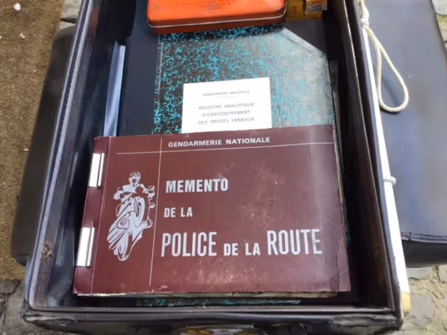 Full parade uniform for French Gendarmerie as also the special luggage carrier for the Gendarmerie with the bags, radio, booklets, first aid kit, ...