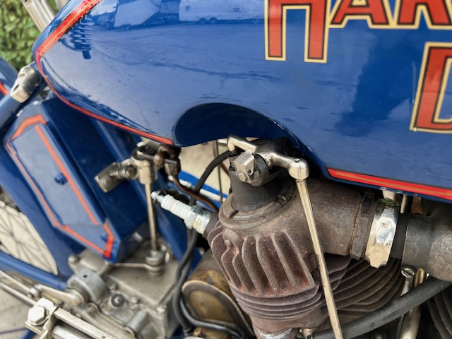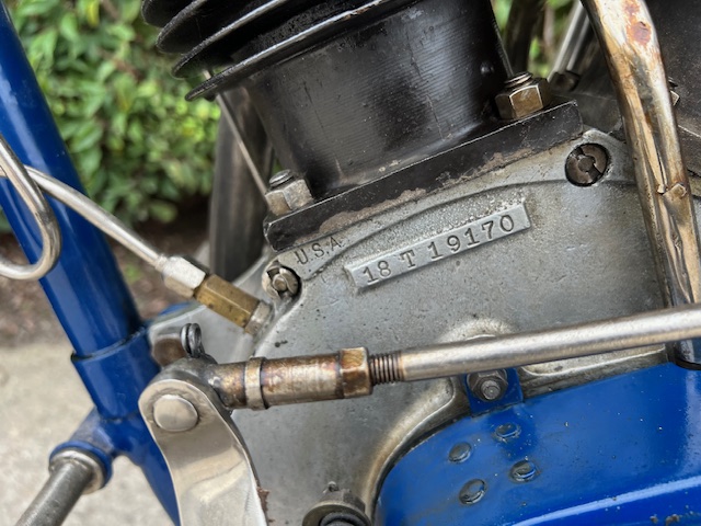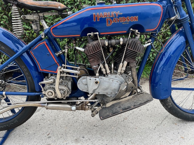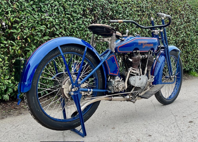 Restored 1918 Harley model. This is a former army motorcycle from World War I, as evidenced by the USA markings on the seat and engine block. The motorcycle was restored several years ago and has completed two Tour de Provence rides without any issues.