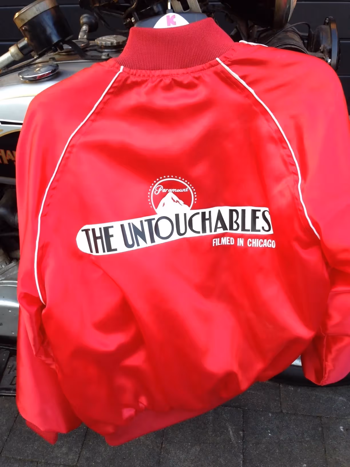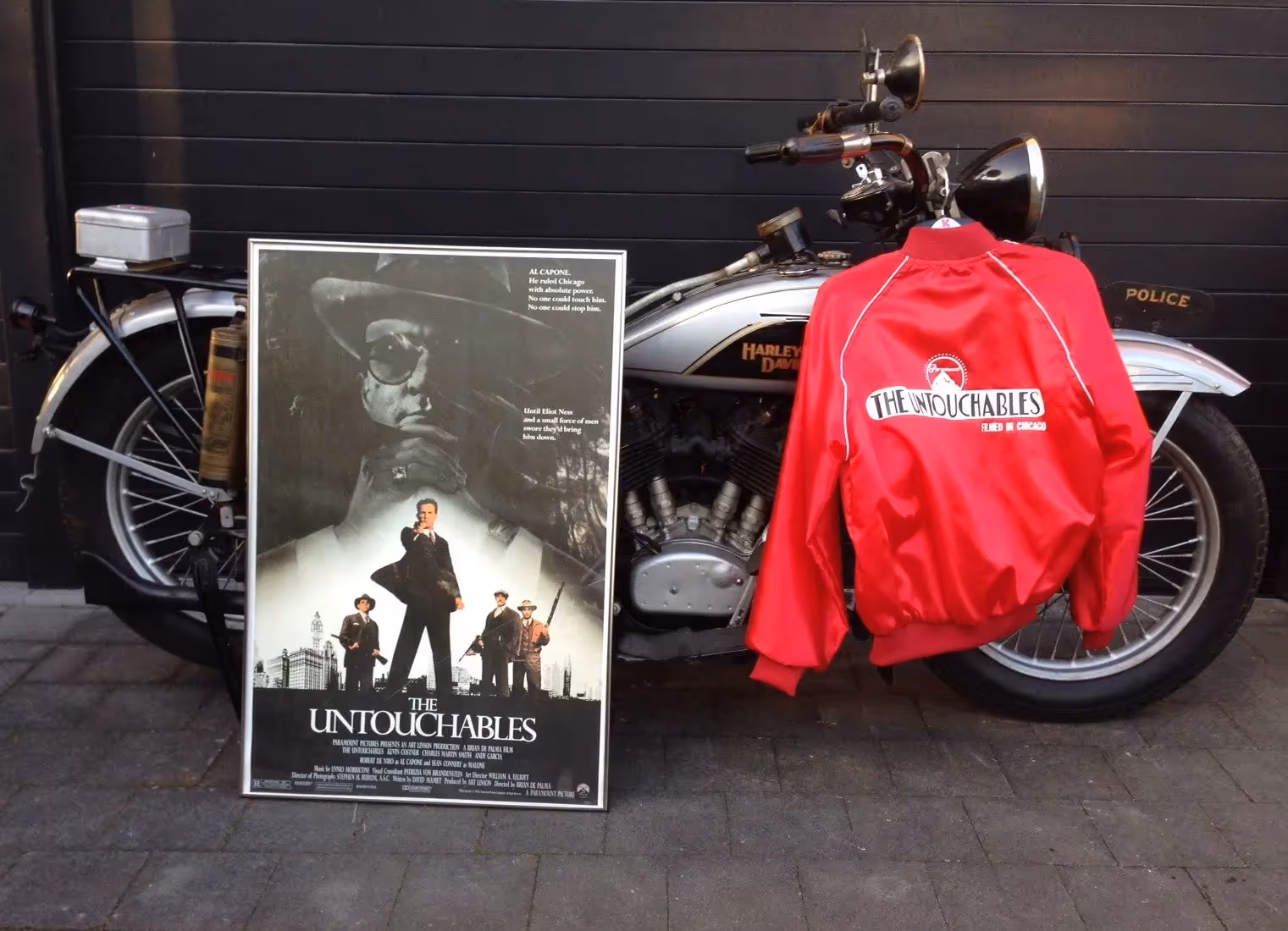 This Harley is in good driving condition. All police attributes are present such as the red light, double needle police odometer, pump, first aid kit, copper fire extinguisher, bat, poster of the movie and the original jacket Wayne Pierce got at the shooting as an appreciation for making the bike available during the Chicago shooting.