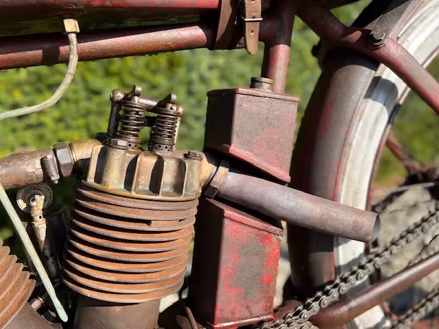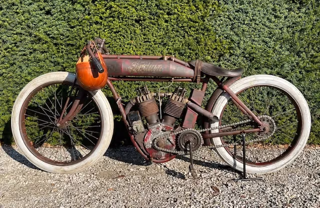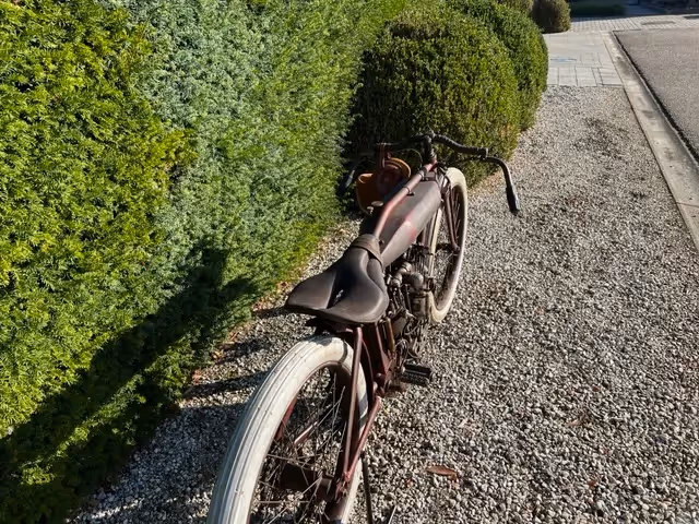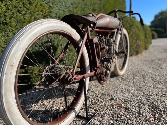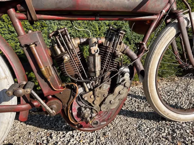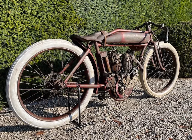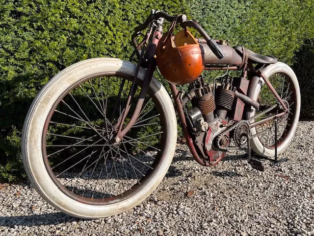 The normal model of indian was an OHV side valve. For racing, Indian made a 4 (2 valves per cylinder) or 8 (4 valves per cylinder) racer. These were never sold even though they were in the catalog but were only loaned to the factory racers and to the most promising riders. Rarely do these motorcycles come up for sale. These are the motorcycles that reached speeds of over 200km/h on the wooden murderdromes and this in 1914! These motorcycles were pushed into motion on the bowl lanes or pulled into motion by another motorcycle using a cord. Then they did a tour behind the pace car and had a flying start for the race (here is a nice video of this : https://youtu.be/QPZY-MUx8qk ). These motorcycles had no brakes. This was too dangerous to ride because one could hinder a rider behind by suddenly braking. These motorcycles also had no throttle cable because they were mostly run at full throttle (controlled by a trade on the carburetor) and speed was controlled by the pre-ignition and by the killswitch on the handlebars.