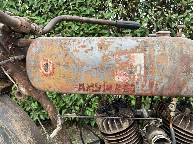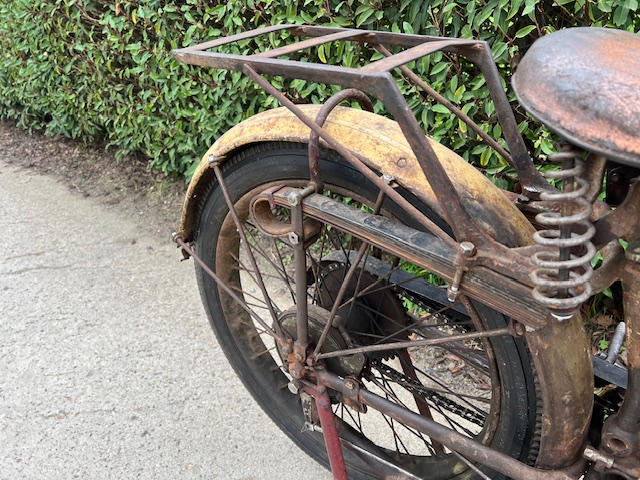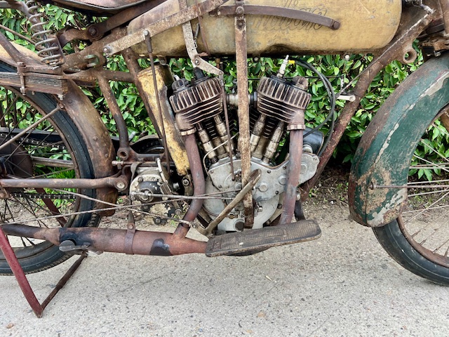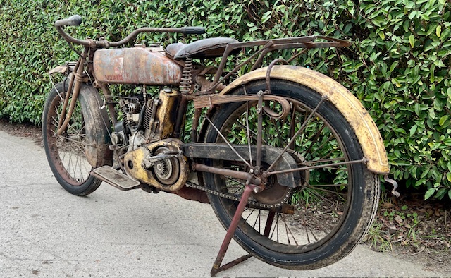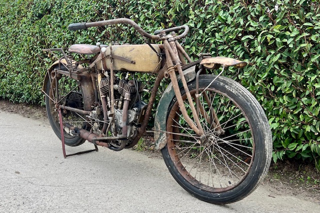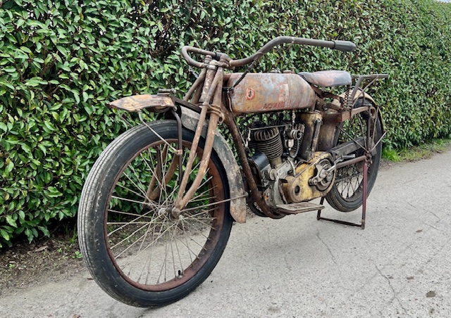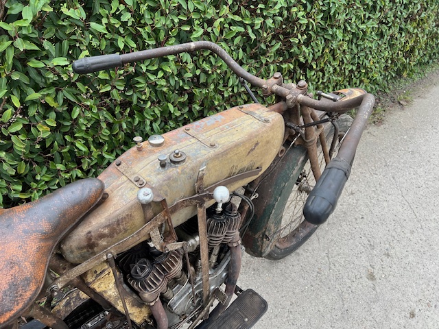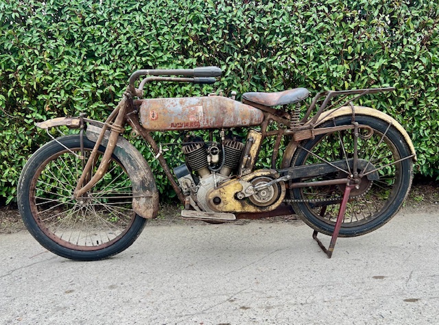 American Indian model Powerplus. This is a 1000cc side valve motorcycle from 1917. A rare model that was only manufactured for one year. The Powerplus was launched in 1916 and this engine was mounted in the old frame of the overhead side valves. The following year, in 1917, this stronger frame was launched, but still with the rods as controls. In 1918, these were replaced by cables. This motorcycle is completely original and has been technically overhauled. One kick and it runs. This motorcycle served with the French Red Cross; AMBULANCE is still written on the bottom left of the tank.