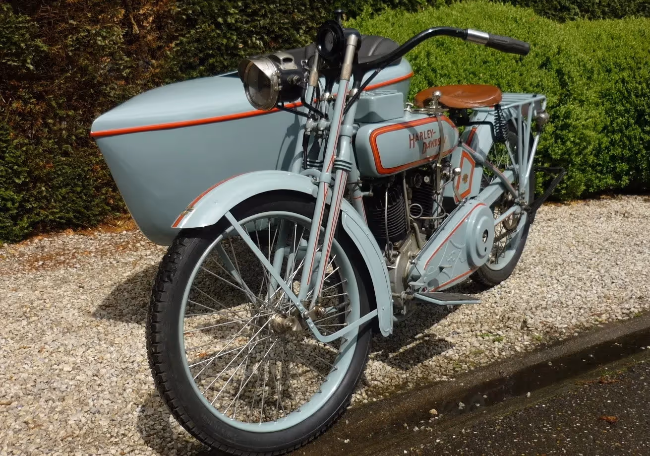 Older but very nice restoration of a Harley-Davidson model J from 1917. This is an ex military WOI 1000cc motorcycle with sidecar.