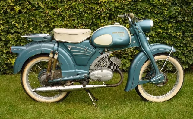 German Zundapp KS 50 Falconette in first paint. Completely original and good running. This is a 50cc 2 contact with 4 foot gears.