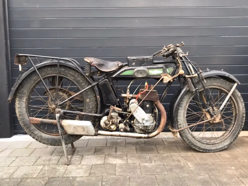 French Magnat-Debon model BMS. This is a 350cc side valve sport version from 1926. Magnat-Debon was one of the French motorcycle pioneers but after the 2 World Wars they had a hard time and in 1922 they were taken over by Terrot. Due to the strong network of dealers Terrot decided to keep the brand name but the same models were built at Magnat-Debon as at the parent company Terrot. This model is almost identical to the Terrot model HS of 1926. This motorcycle is completely original and in running condition. In the material box on the tank is the drive chain to the rear wheel. This was once broken and never repaired, this is probably the reason why this motorcycle still looks so good after 94 years.