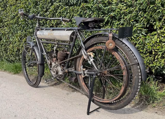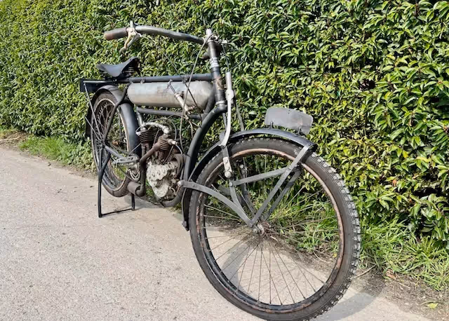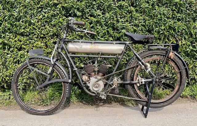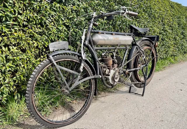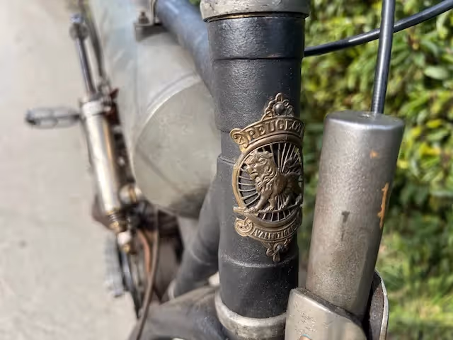 French Peugeot model Légère of 1913. In 1910 Peugeot came out with the model Légère, this is a 330cc V-twin that looked very nice and was very reliable. This was a sales success for Peugeot. The 2 cylinder and small 330cc capacity made it very easy to start and very manageable. This little engine was good for a top speed of 60km/h. In 1913, the stroke was enlarged from 70 to 80mm and thus obtained a 380cc. Recognizable by the 10 cooling fins instead of 8 and the horizontal placement of the spark plugs. This 380cc engine was now good for 70km/h. This year was also the last year of the round tank between the tubes.