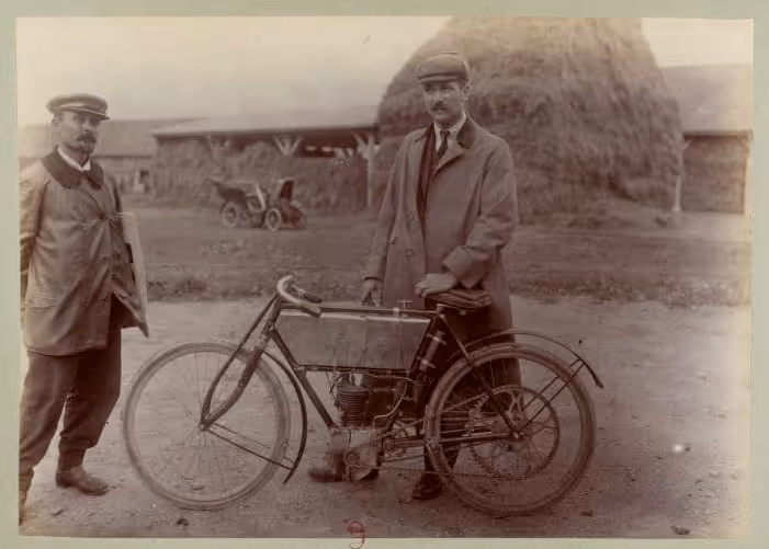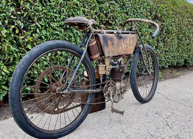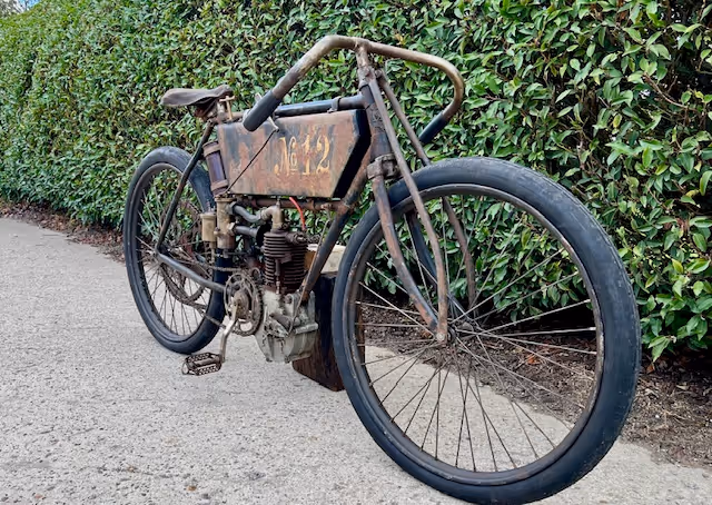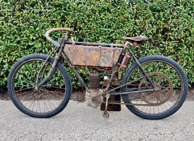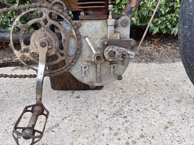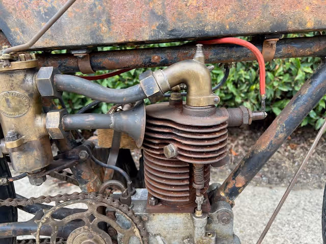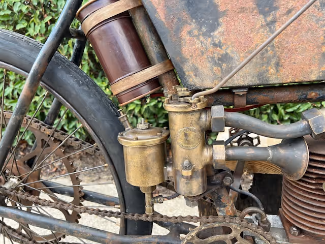French Peugeot model 1903 type C in racing version. This is a 240cc with snuff valve as intake and a steered exhaust valve. Basic is an ordinary 1903 Peugeot but with several racing options. Like a reinforced front fork, a closed blind race cylinder (normally these have a loose head), the big Longeumare race carburetor, n very special conversion from belt drive to chain!!!! See original photo.