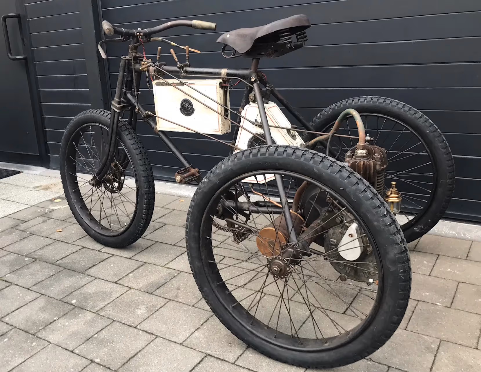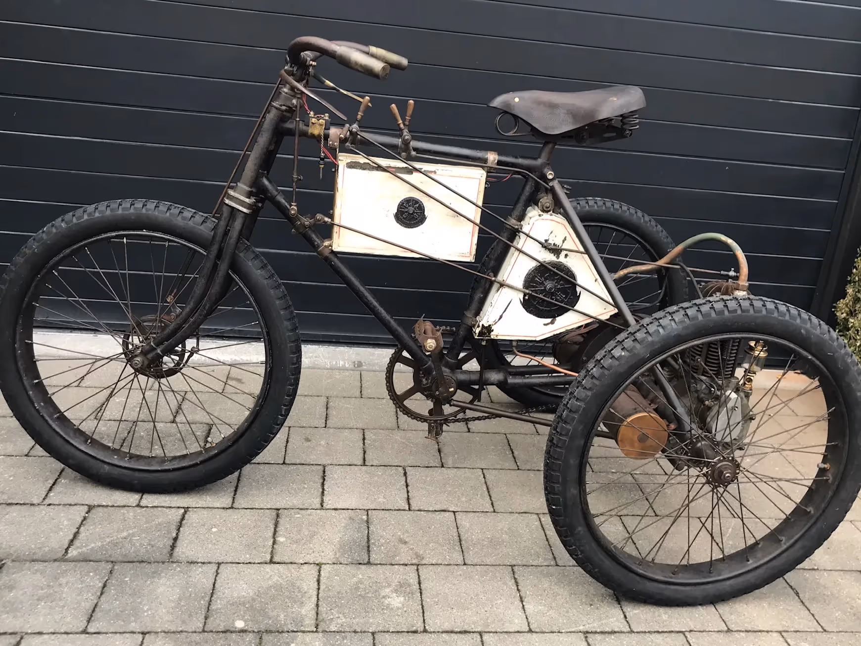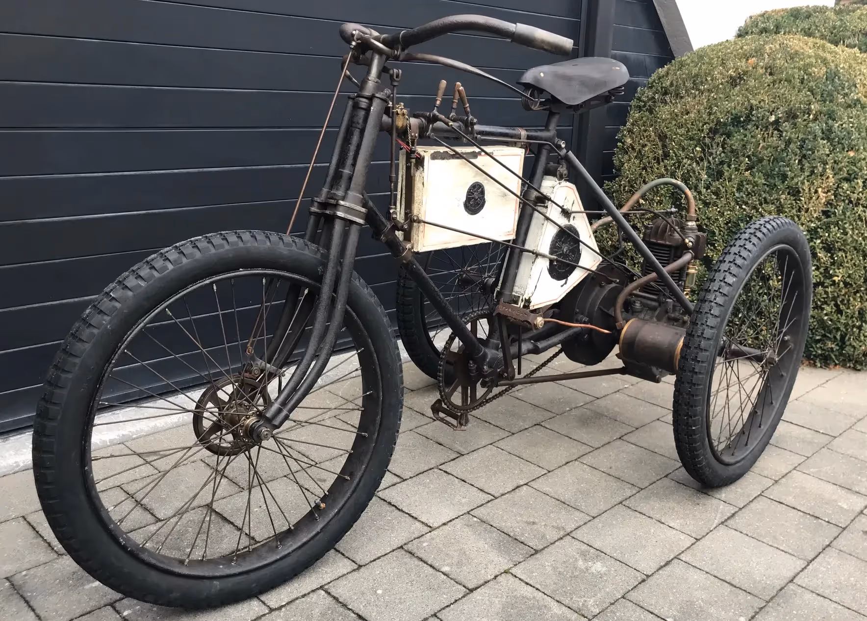This tricycle has the special front brake for racing and has the large front sprocket for speed. Because of this there is a special mounting of the surface mounted carburettor. Engine is a Dion de Bouton. Fully serviced and in working order on modern carburettor. Surface-mounted carburettor is complete and original but still needs to be checked.