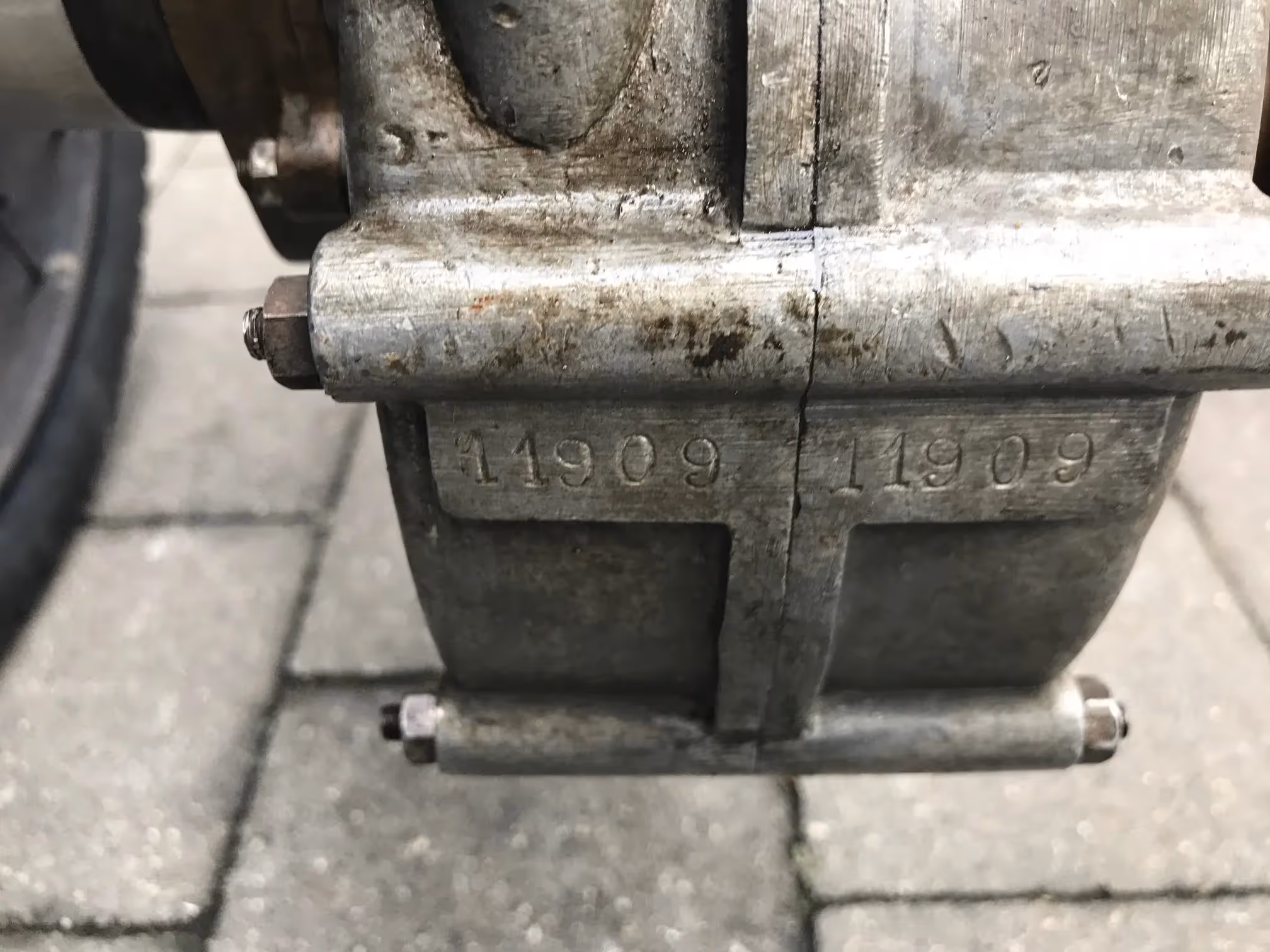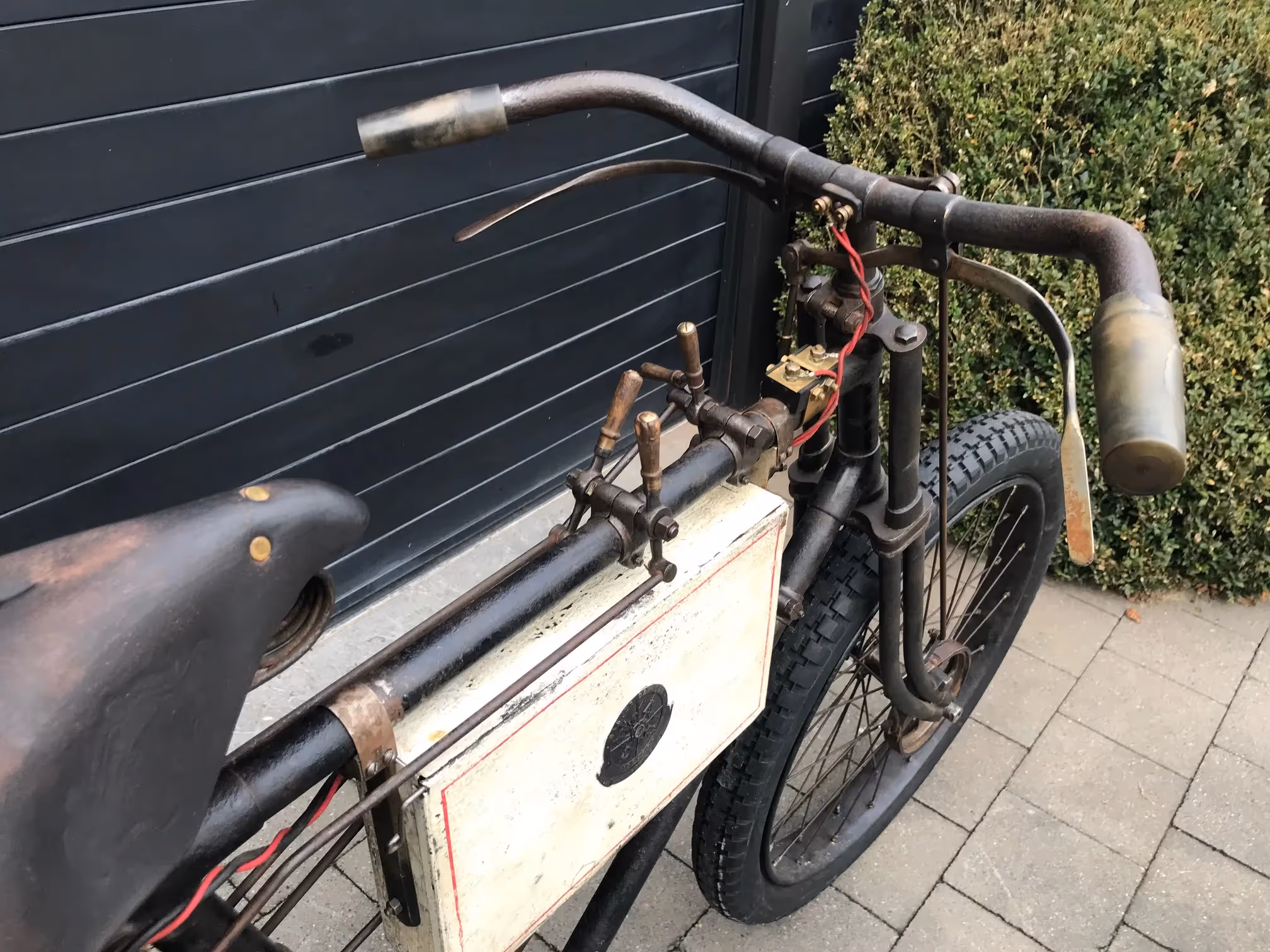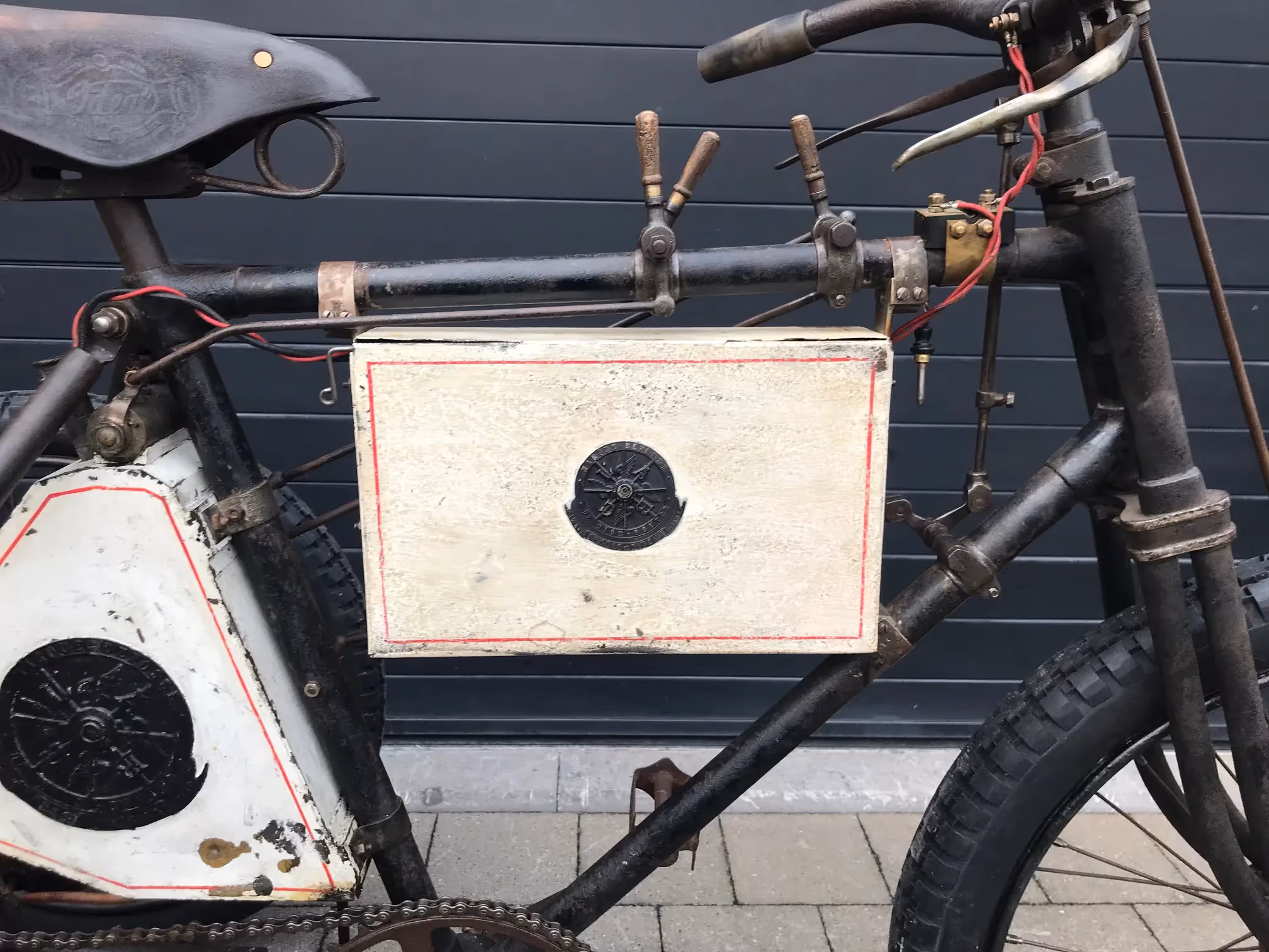 This tricycle has the special front brake for racing and has the large front sprocket for speed. Because of this there is a special mounting of the surface mounted carburettor. Engine is a Dion de Bouton. Fully serviced and in working order on modern carburettor. Surface-mounted carburettor is complete and original but still needs to be checked.