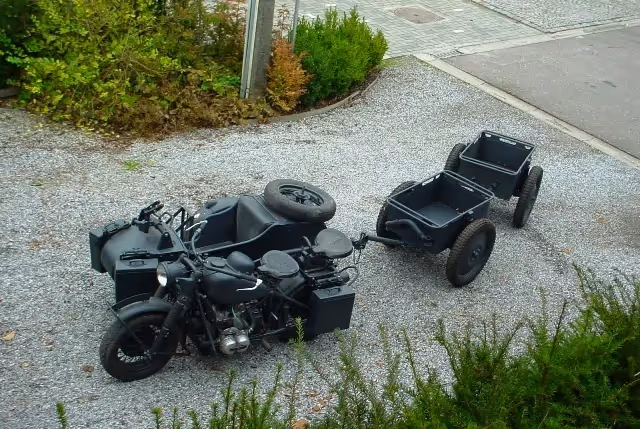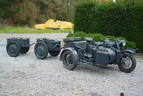 German BMW model R75 from 1945. This is a 750cc boxer with powered sidecar and IF-8 trailer. Motocycle is good running and complete with jerry can, material boxes, covers and rifle support.