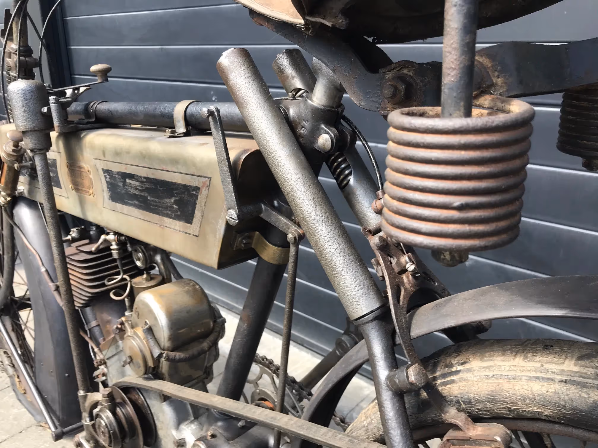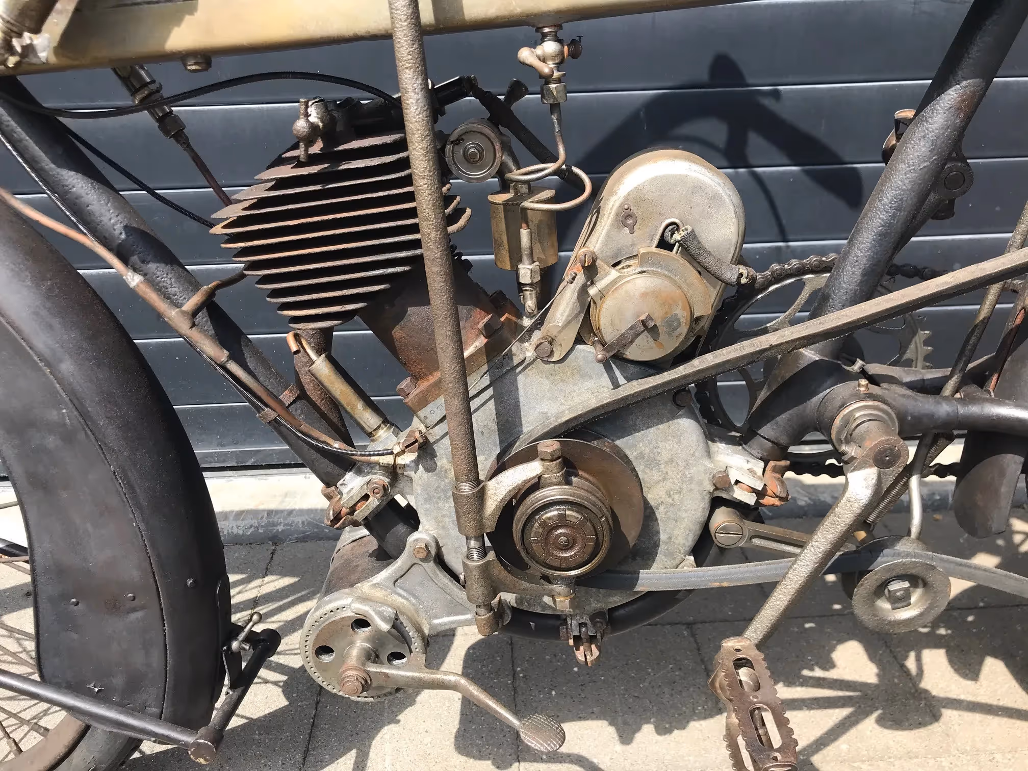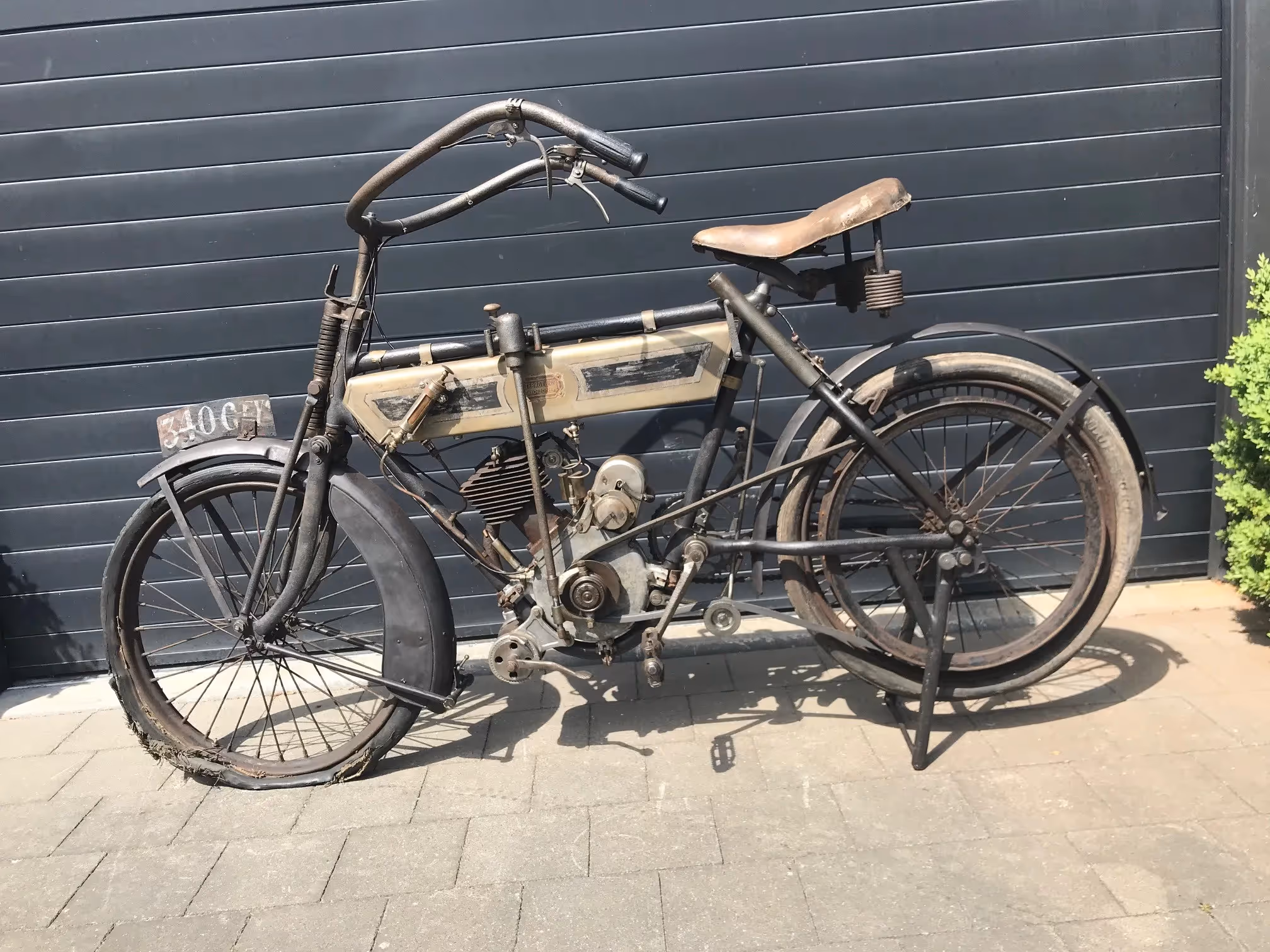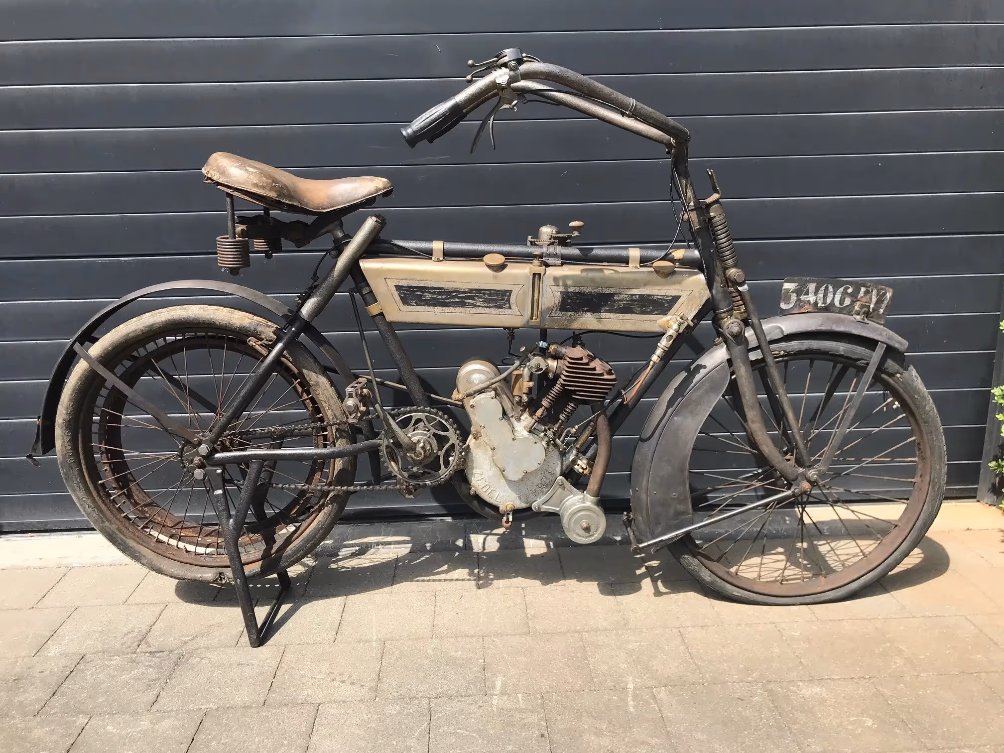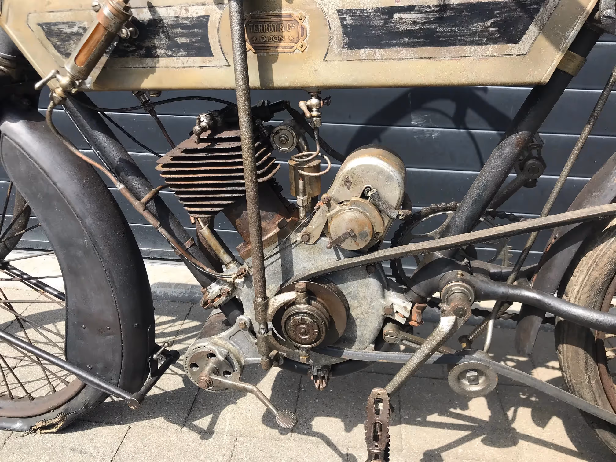 French Terrot Motorette N°3. This is a 317cc side valve from 1913 with many options. This motorcycle is the successor of N°2 which was a 264cc IOE with sniff valve. This motorcycle has several options like the new rear suspension frame (Nouvelle suspension élastique), cap over magneto and the gears via a kind of vario-matique (Changement de vitesse progresssif). This is a rare version which is very easy to ride during rides because of all these rare options. Motorcycle is in original very nice unrestored condition and needs little work to get it running again.