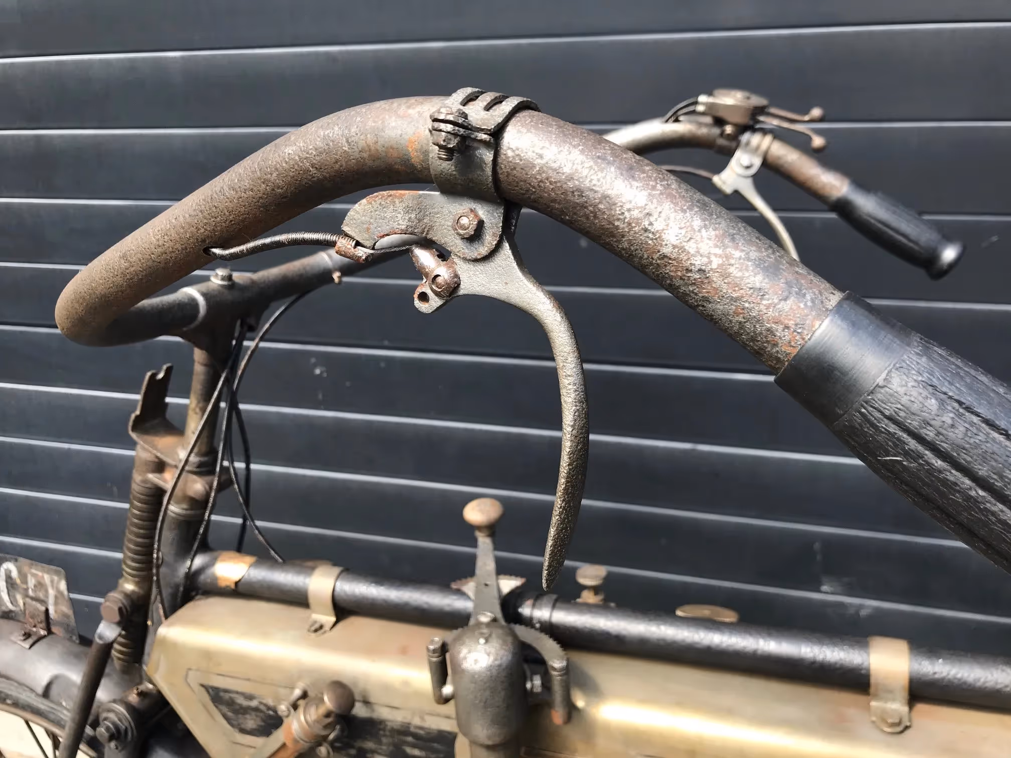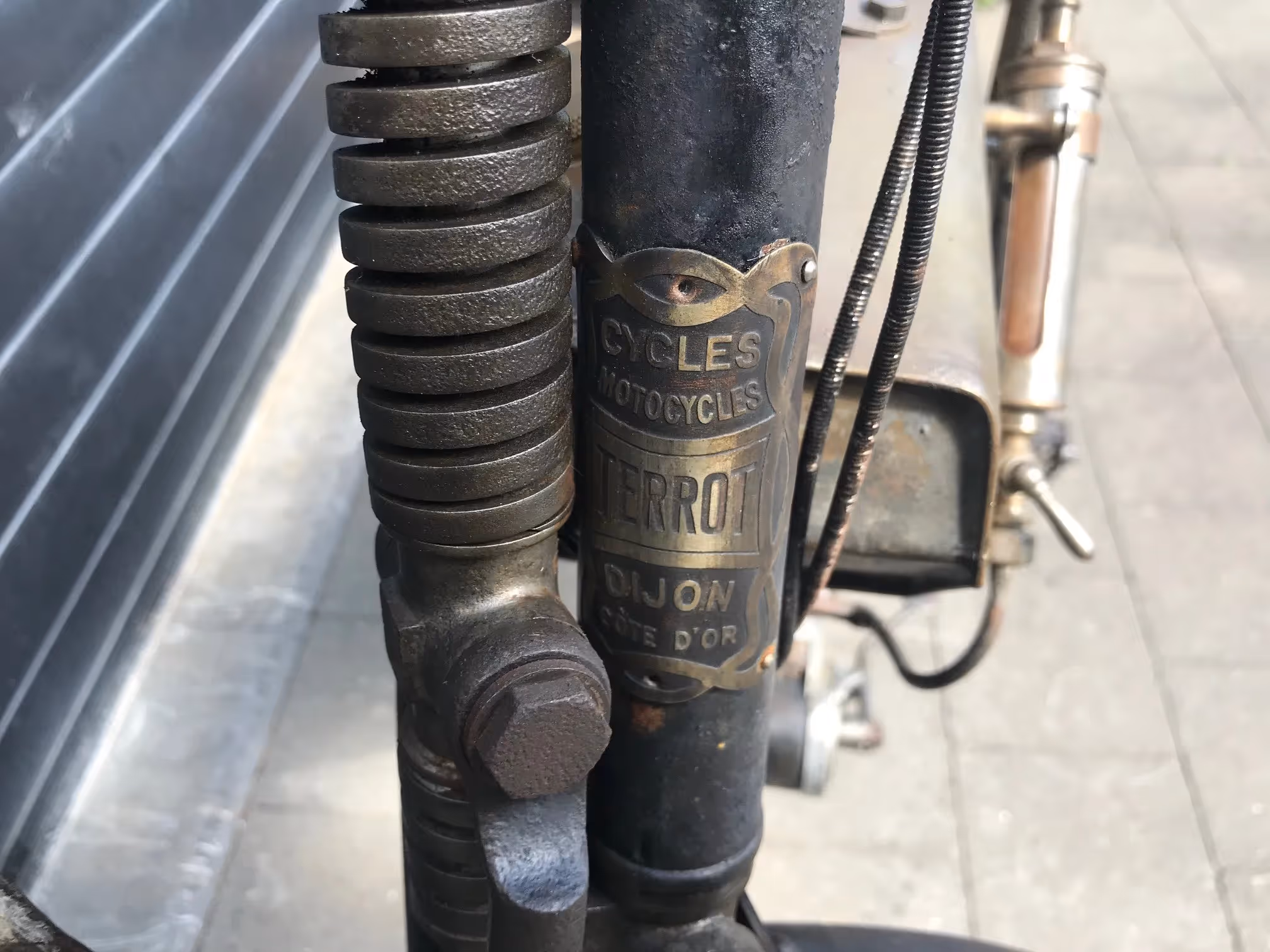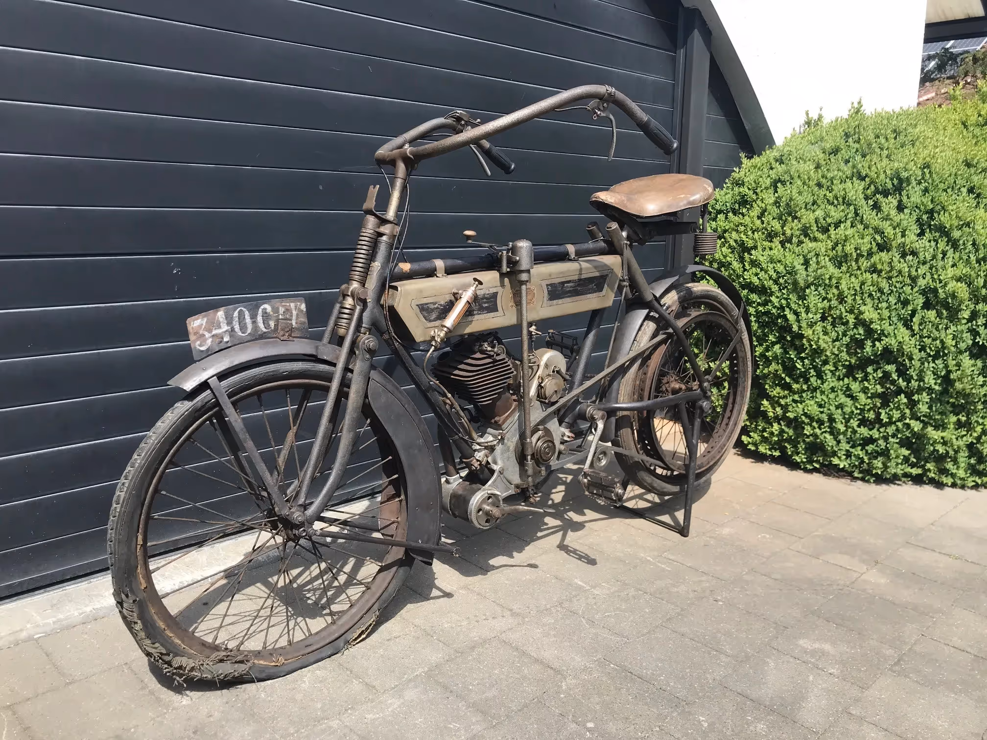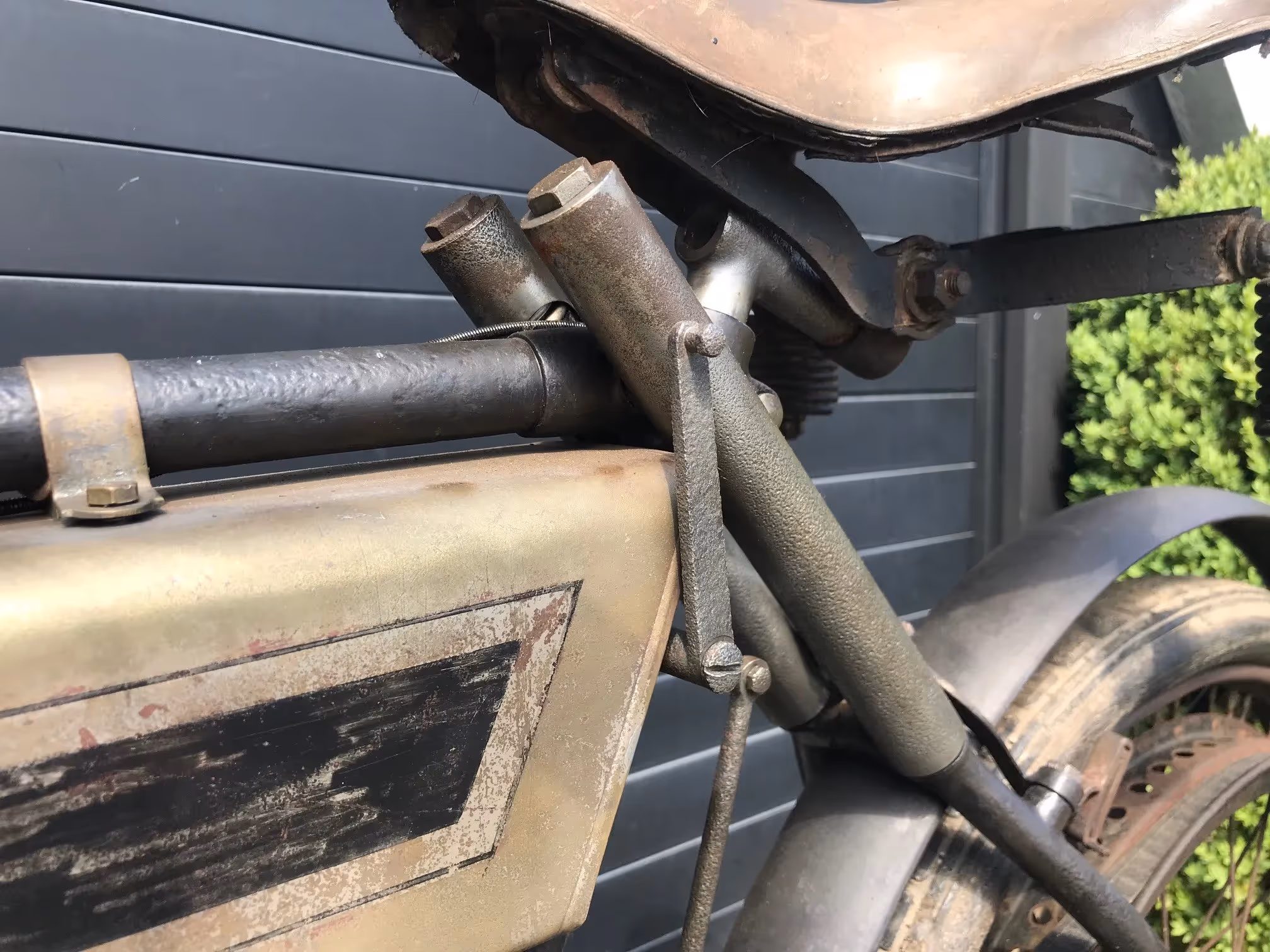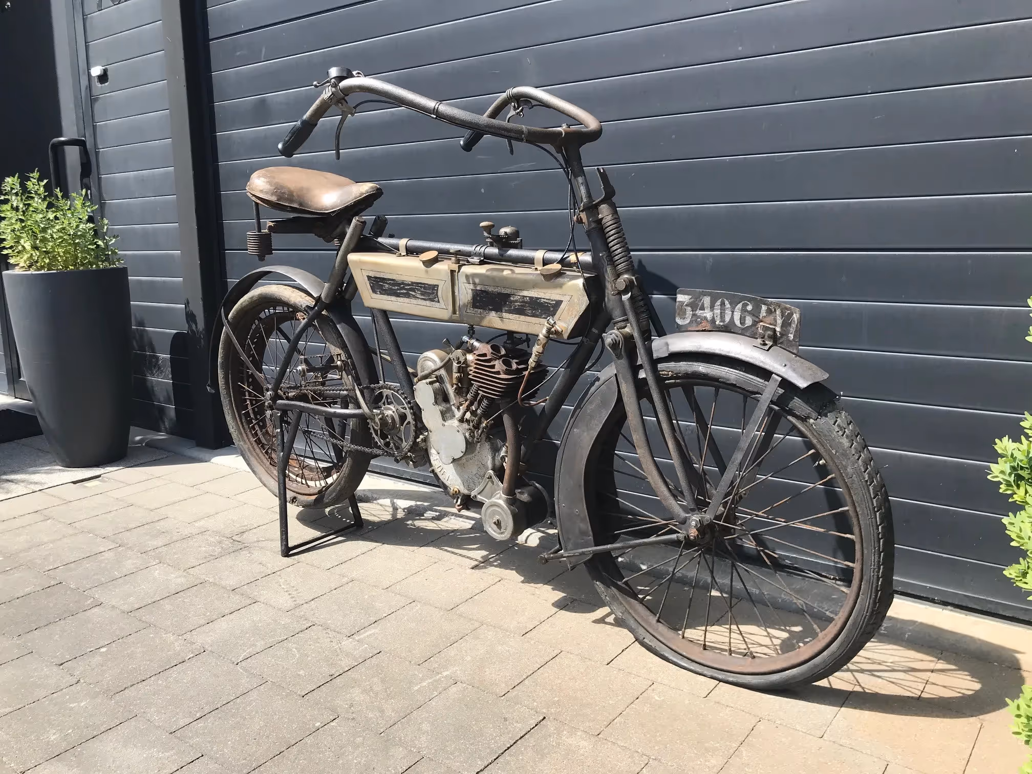 French Terrot Motorette N°3. This is a 317cc side valve from 1913 with many options. This motorcycle is the successor of N°2 which was a 264cc IOE with sniff valve. This motorcycle has several options like the new rear suspension frame (Nouvelle suspension élastique), cap over magneto and the gears via a kind of vario-matique (Changement de vitesse progresssif). This is a rare version which is very easy to ride during rides because of all these rare options. Motorcycle is in original very nice unrestored condition and needs little work to get it running again.