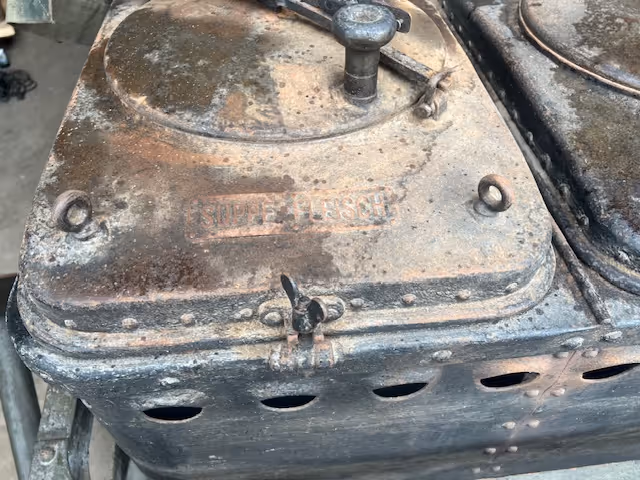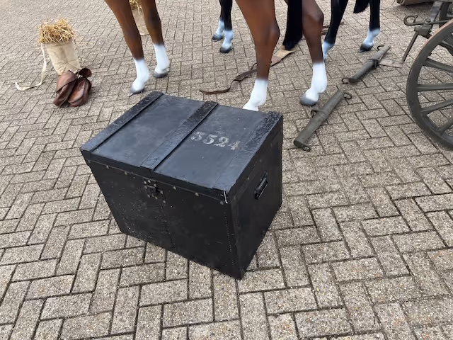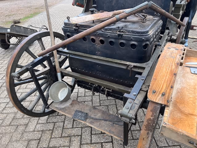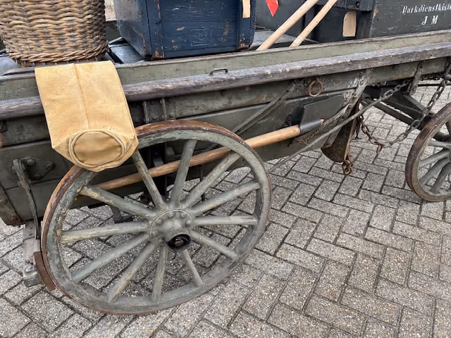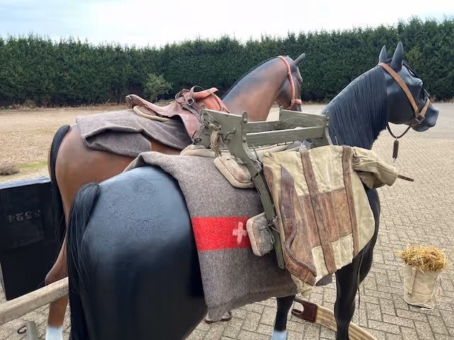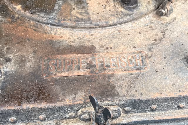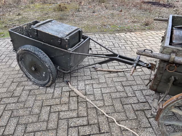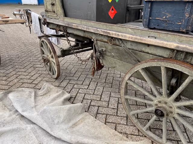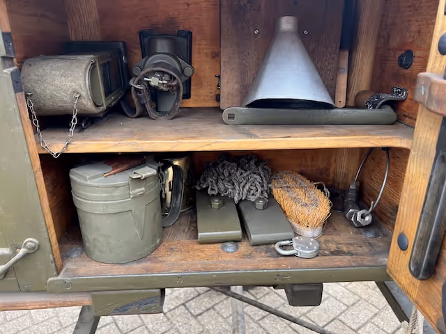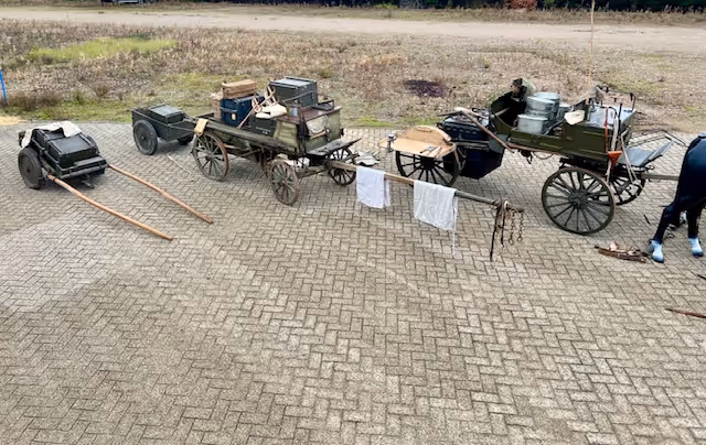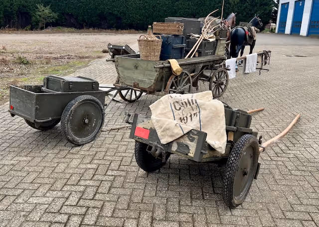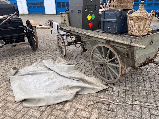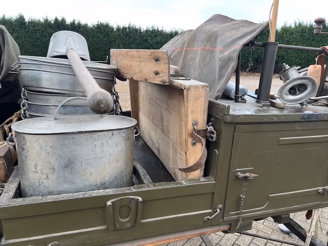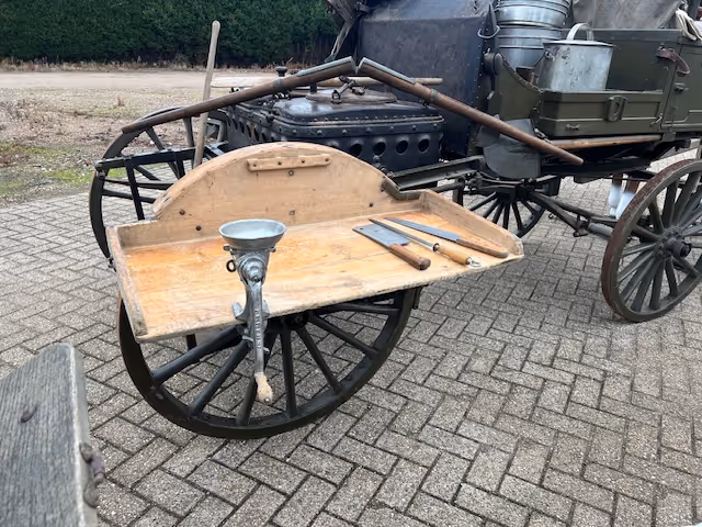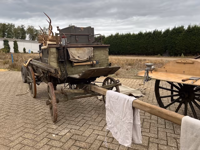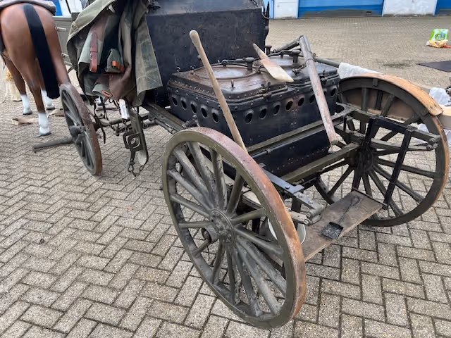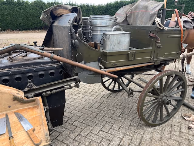 Field kitchen (Goulashkanone) with World War I supply carts, complete and brand new! The field kitchen carriage is complete with all cooking utensils and butcher supplies. The second carriage is a supply cart that was used to transport food. This carriage also has the trailer that was used to carry the firewood for the boilers. This carriage also has the drawbars to be pulled by one or two horses. The third small carriage could be pulled by one horse and was used to collect extra firewood in the woods or to collect animal carcasses to cut up and incorporate into food on the main carriage. These wagons contain many small original items not detailed in the photos.Many of these extras are stamped 1916-17-18. A unique opportunity for a museum or reanactment group.
