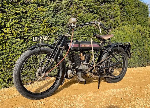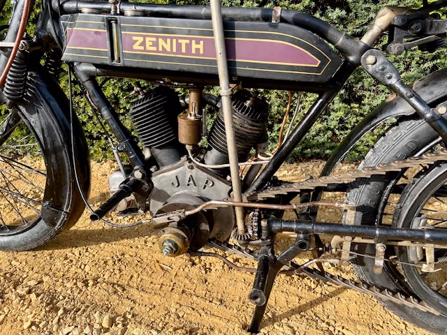 Zenith was built in England between 1904-1950. The problem with these early belted engines is that they have only 1 gear (first real gearbox was from AJS in 1913). In a hilly environment, this is a problem. In 1907, Freddie Barnes at Zenith designs an ingenious system to solve this without using a real gearbox. On the tank is a large carousel that allows the front pulley to open and close. Fully open, the belt runs on a roller bearing and the engine is in neutral. Turned closed, the belt runs higher in the pulley giving you a different gear ratio (Gradua = Gradual gearing). But this makes the belt either too long or too short, causing it to slip. Zenith had solved this problem by also shifting the entire swingarm in the 2 horizontal frame tubes to the front or rear so that the distance changes and the tension on the drive belt is always right. This system was so good that Zenith started winning all races and hill climbs. This got so bad that Zenith was excluded from all races to give the other riders a chance at the prize money as well. This in turn was used as an advertising stunt by Zenith. Their Logo was crossed out by a red line with "BARRED" in it. Which referred to the too good system they had and were therefore barred from racing.