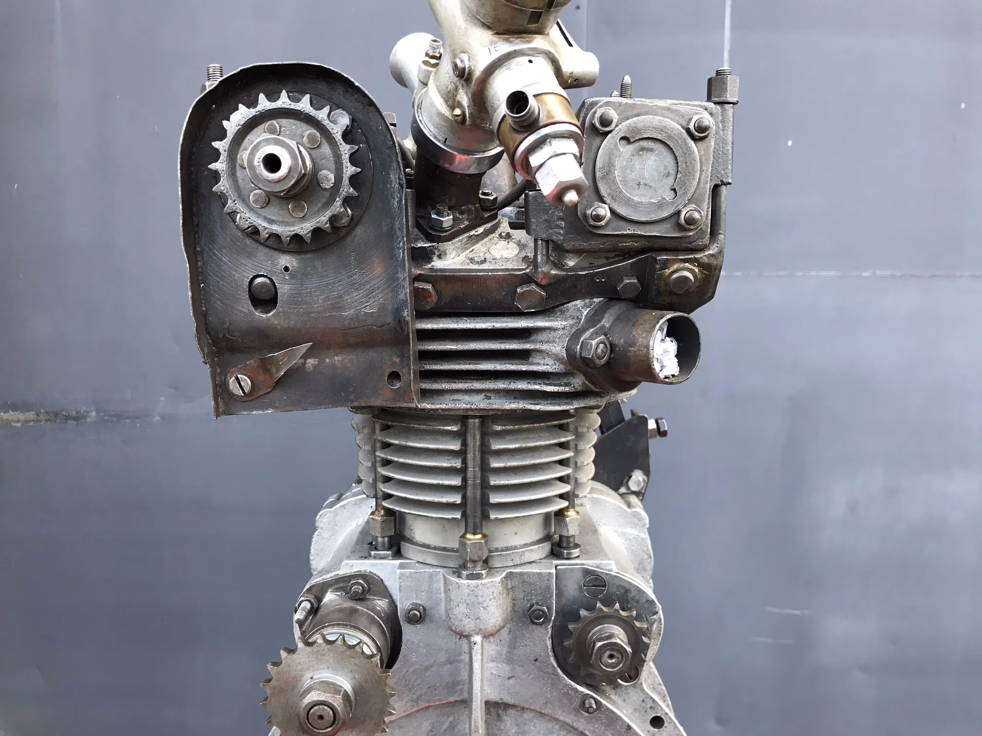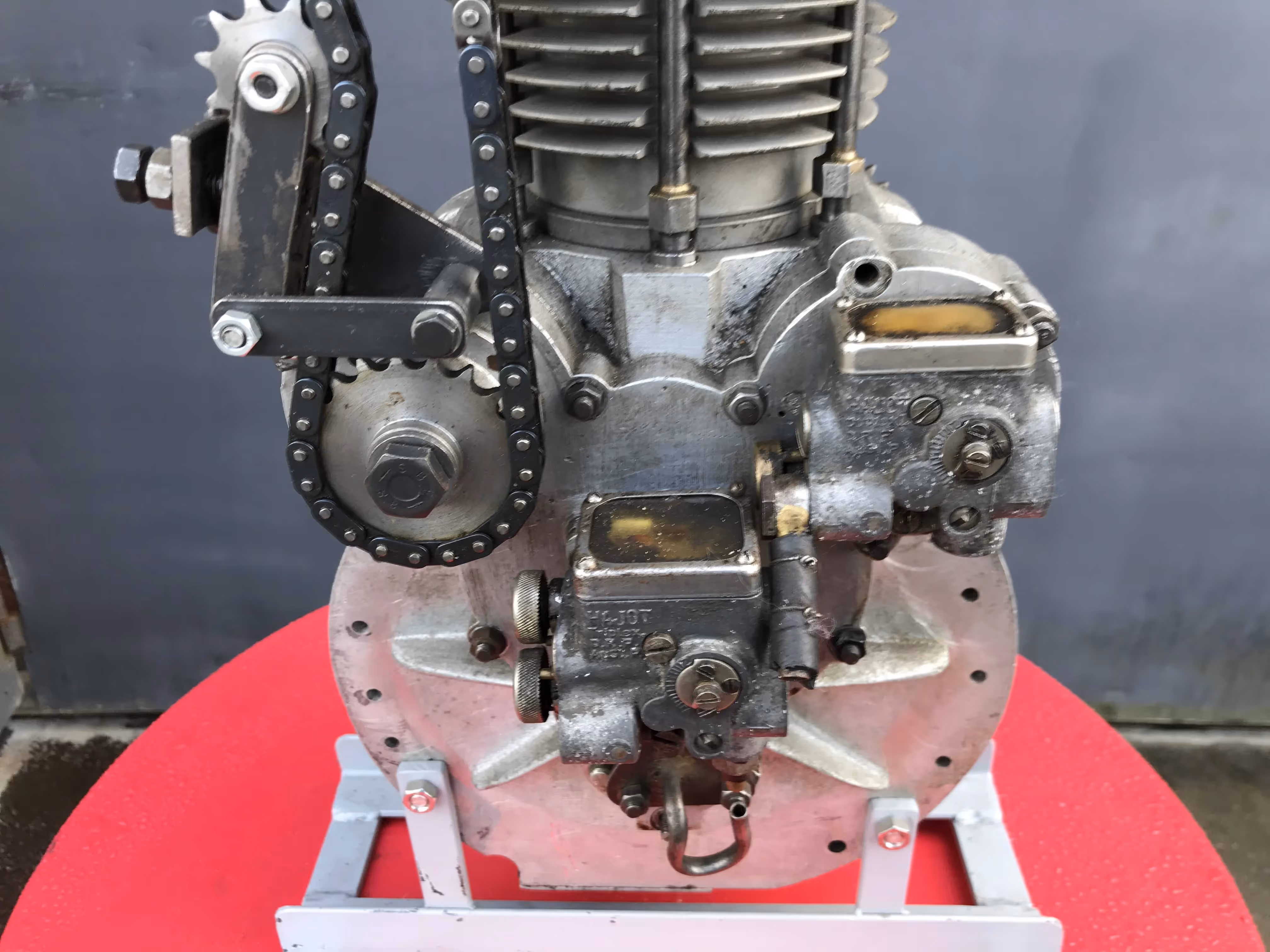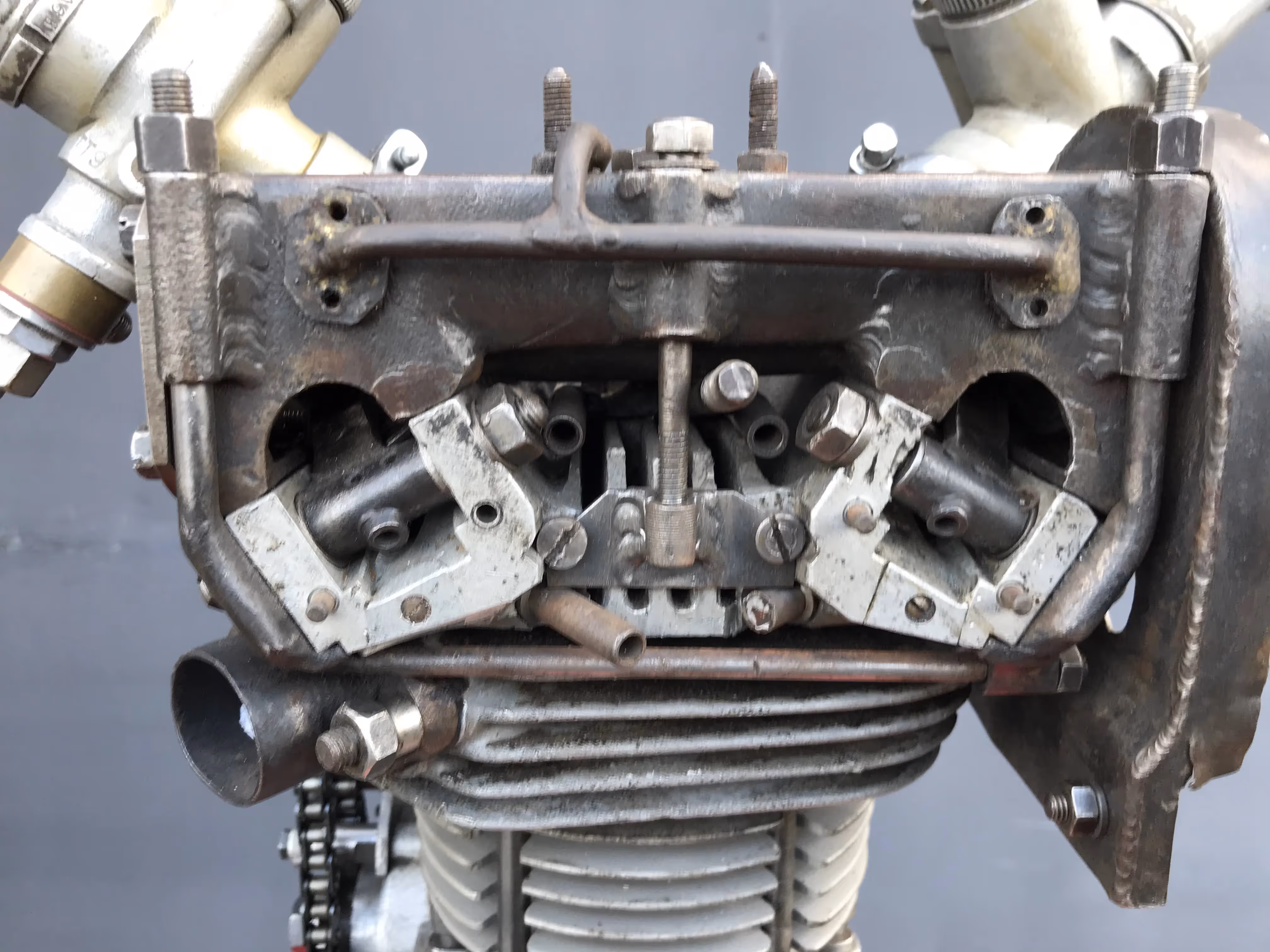 Made and designed by the Austrian engineer Apfelbeck. (...- 1987). He has worked for many car and motorcycle brands such as BMW, Puch, Rotax, KTM,... But you could order from him special racing blocks that never went into big production. So really unique blocks. He had also patented his special cylinder head with special placement of the valves. This was a spherical head. This is a spherical combustion chamber where the valves are angled. The valves were also placed diagonally. This means there was an exhaust and an inlet valve on one ridge. Normally there are 2 inlet valves at the back and 2 exhaust valves at the front. At racer the inlet valves were large when the exhaust gave the side of the inlet the head was weak because of the large valves. By putting a small exhaust valve next to a large inlet, this head was stronger and there was room to put even bigger valves. Because of the double carburetor and the fall-stream system the inlet gasses passed the exhaust valve and it was cooled down. The cams are conical.