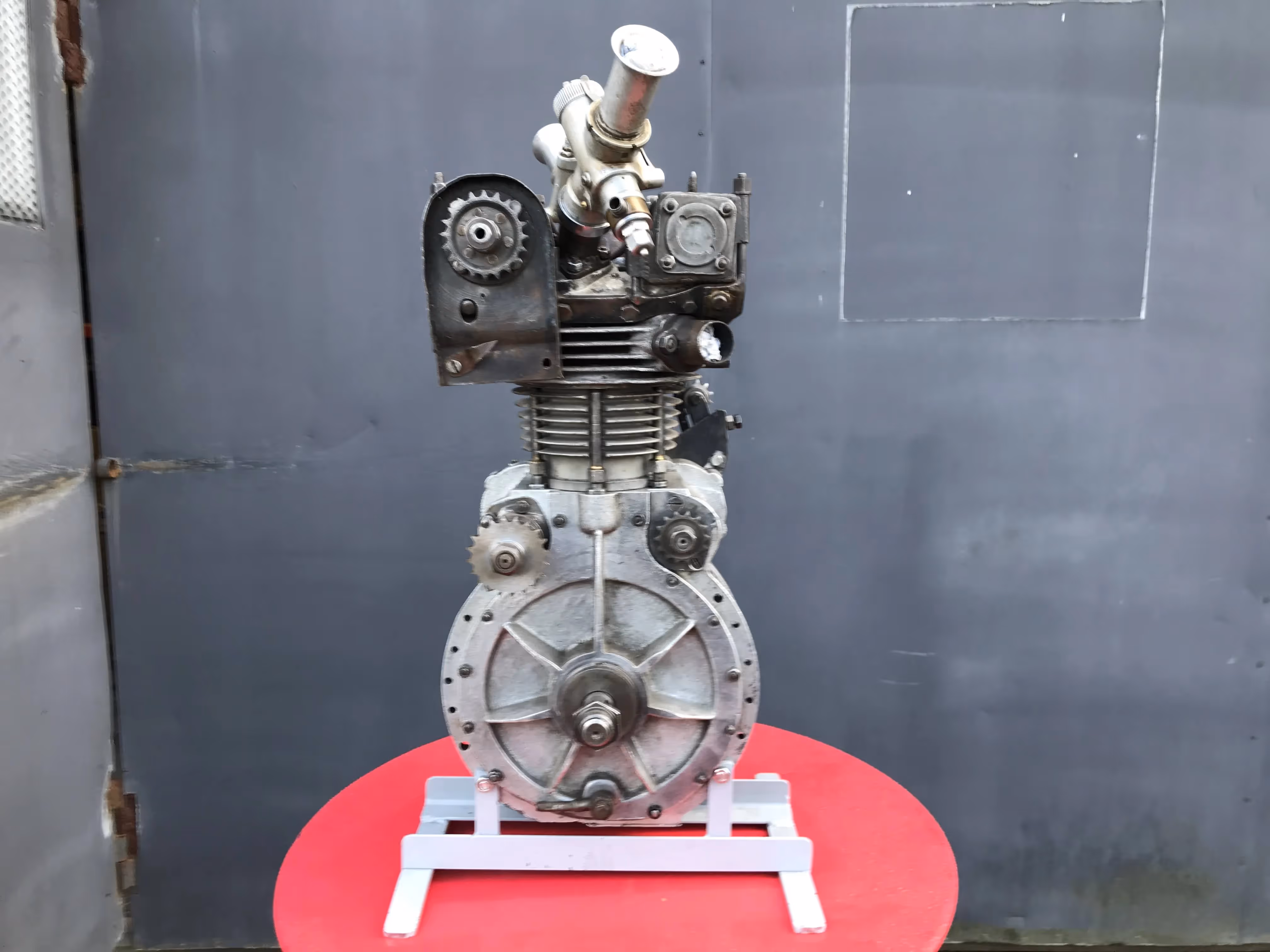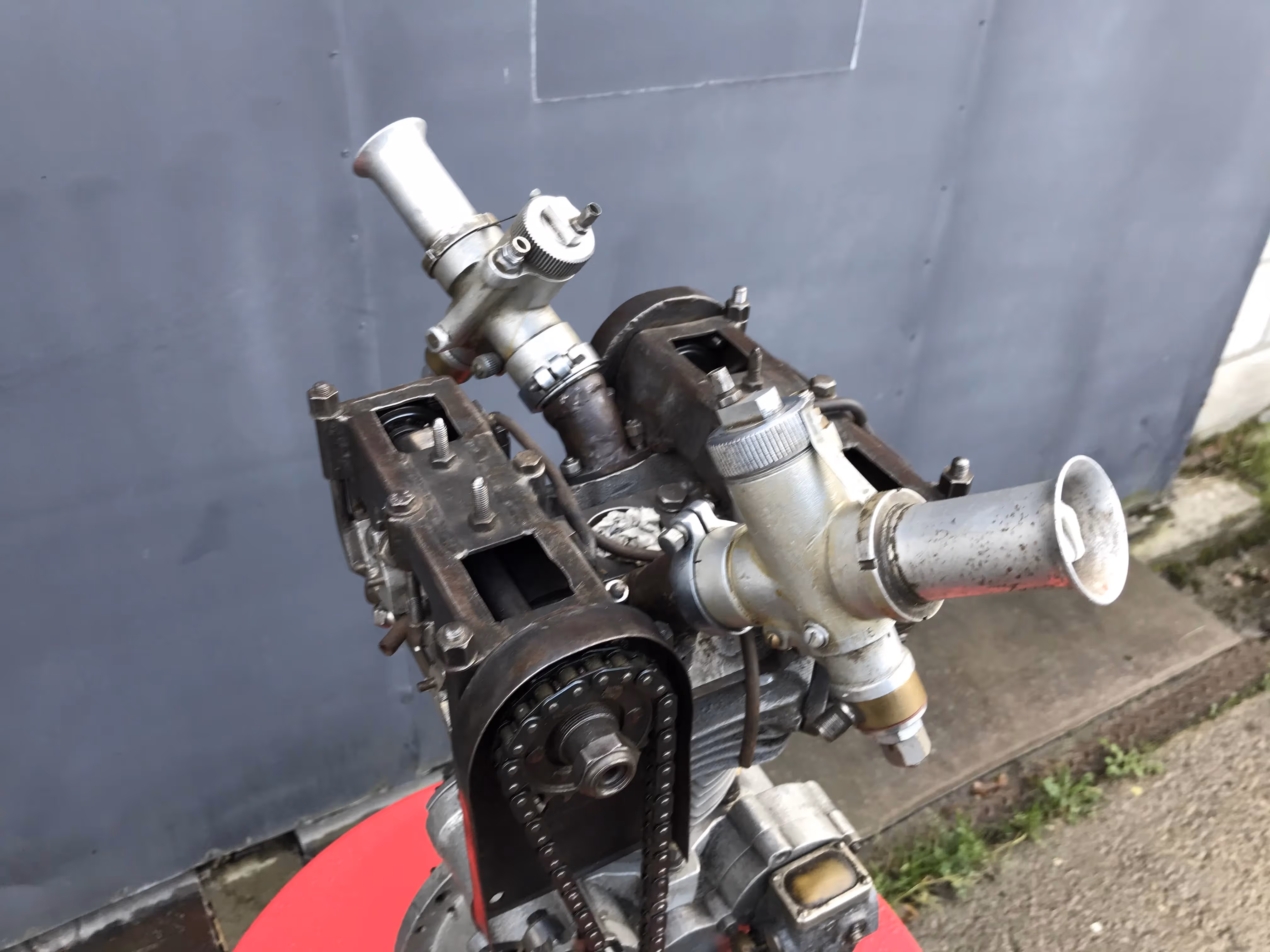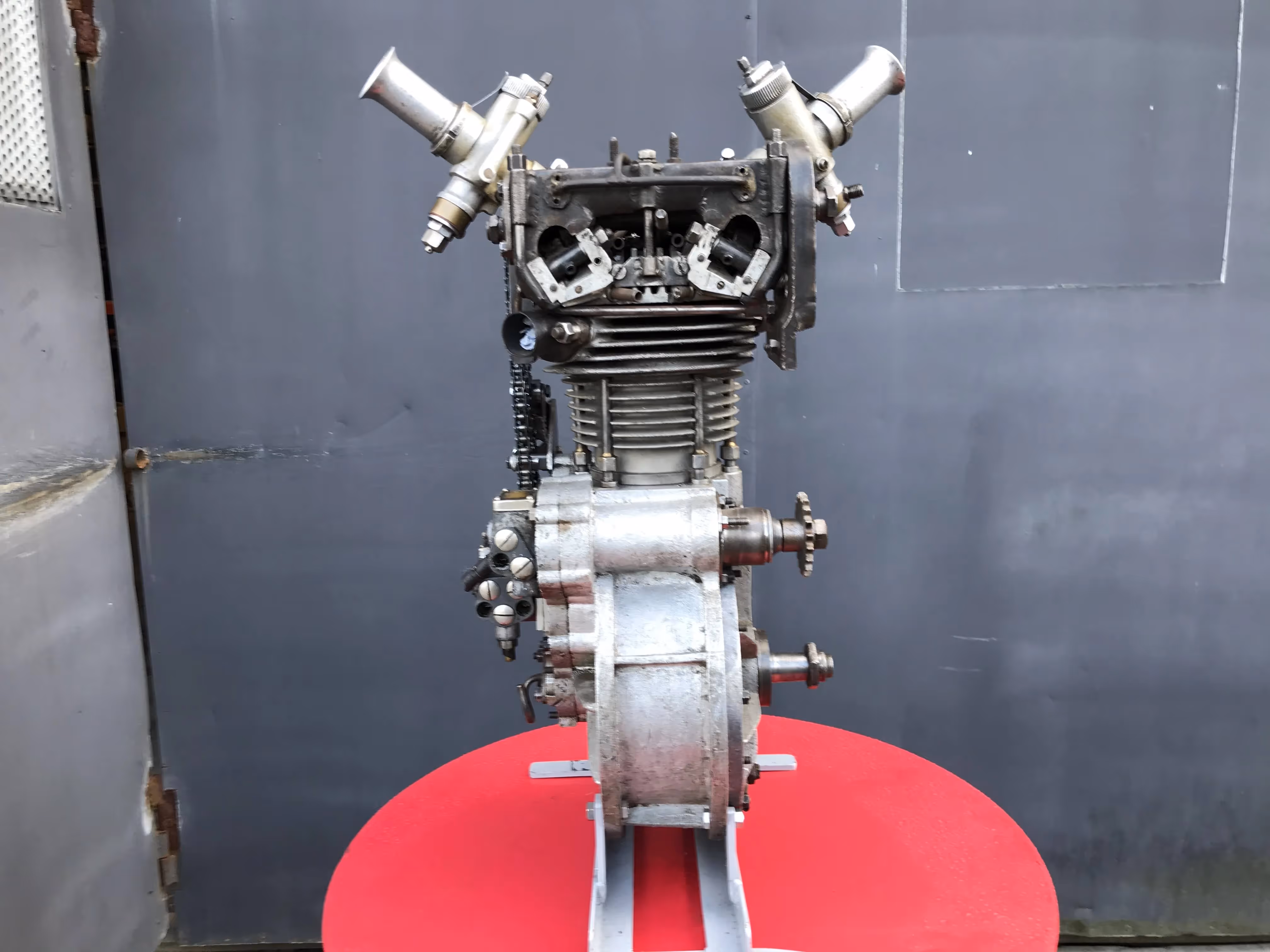 Made and designed by the Austrian engineer Apfelbeck. (...- 1987). He has worked for many car and motorcycle brands such as BMW, Puch, Rotax, KTM,... But you could order from him special racing blocks that never went into big production. So really unique blocks. He had also patented his special cylinder head with special placement of the valves. This was a spherical head. This is a spherical combustion chamber where the valves are angled. The valves were also placed diagonally. This means there was an exhaust and an inlet valve on one ridge. Normally there are 2 inlet valves at the back and 2 exhaust valves at the front. At racer the inlet valves were large when the exhaust gave the side of the inlet the head was weak because of the large valves. By putting a small exhaust valve next to a large inlet, this head was stronger and there was room to put even bigger valves. Because of the double carburetor and the fall-stream system the inlet gasses passed the exhaust valve and it was cooled down. The cams are conical.