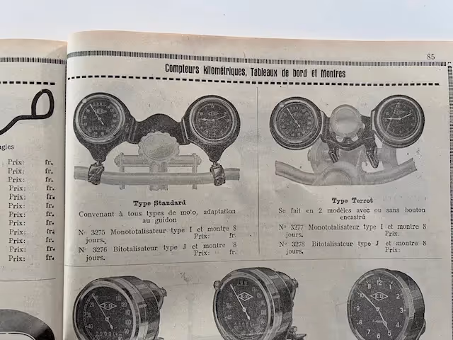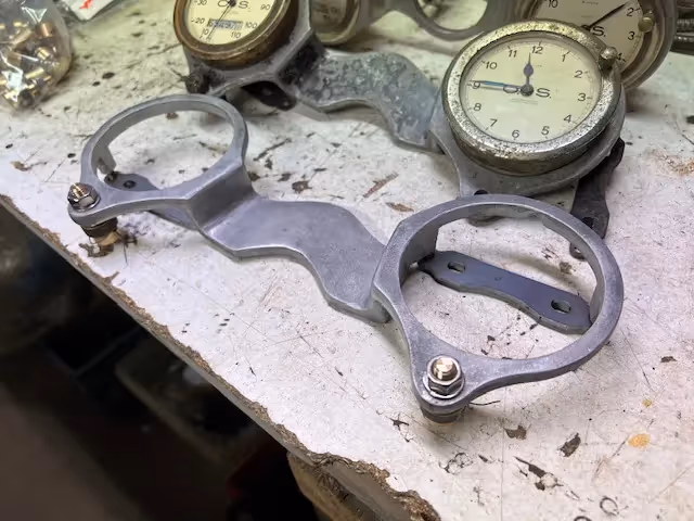 Option for motorcycles from 1925-1940 approximately. Aluminum trim piece for mounting on handlebars. This is a holder to mount odometer and clock or tachometer. An odometer was an option on many motorcycles in the late 1920s early 1930s. This part was in many accessory catalogs to mount an odometer and clock in a nice way on your motorcycle. Fits almost all brands.