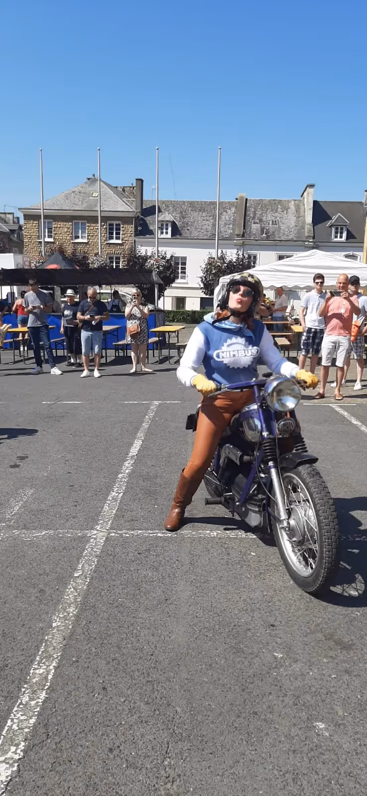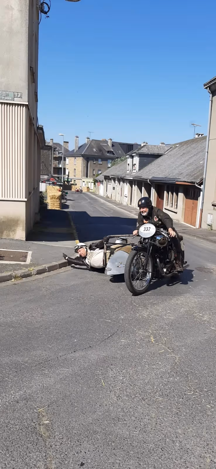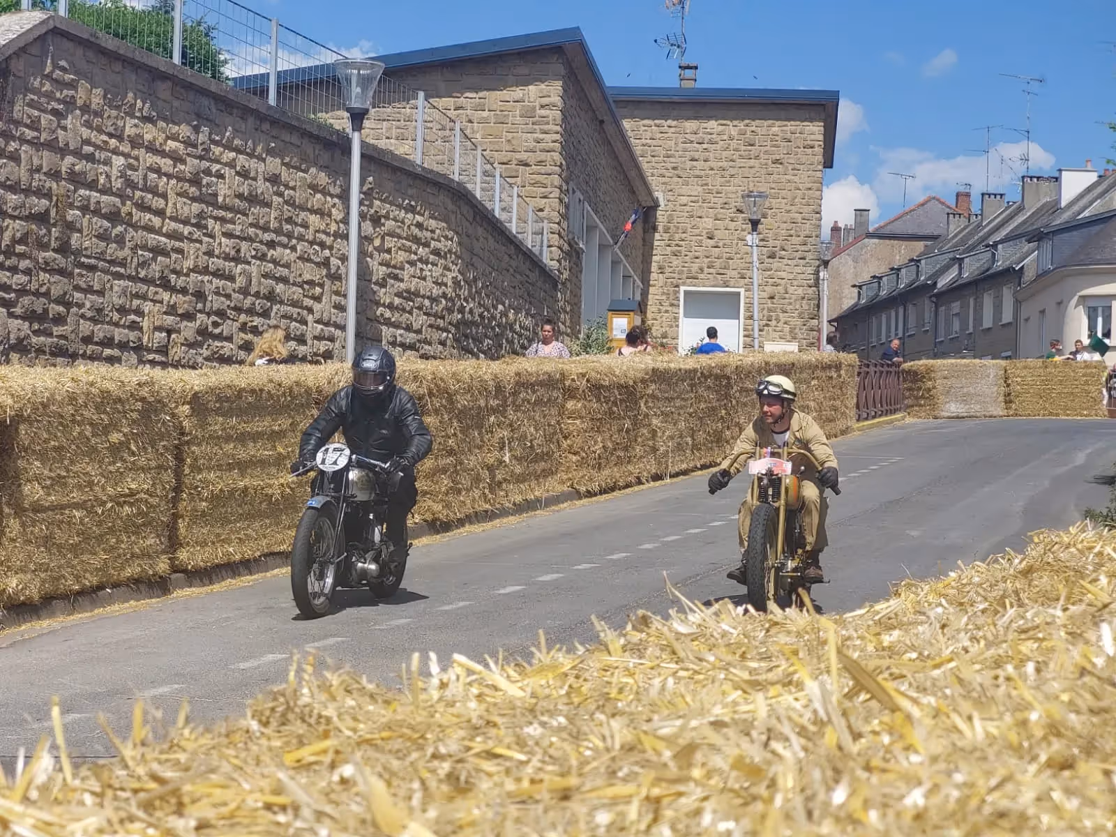 Racing old motorcycles in northern France in a village completely sealed off with bales of straw.